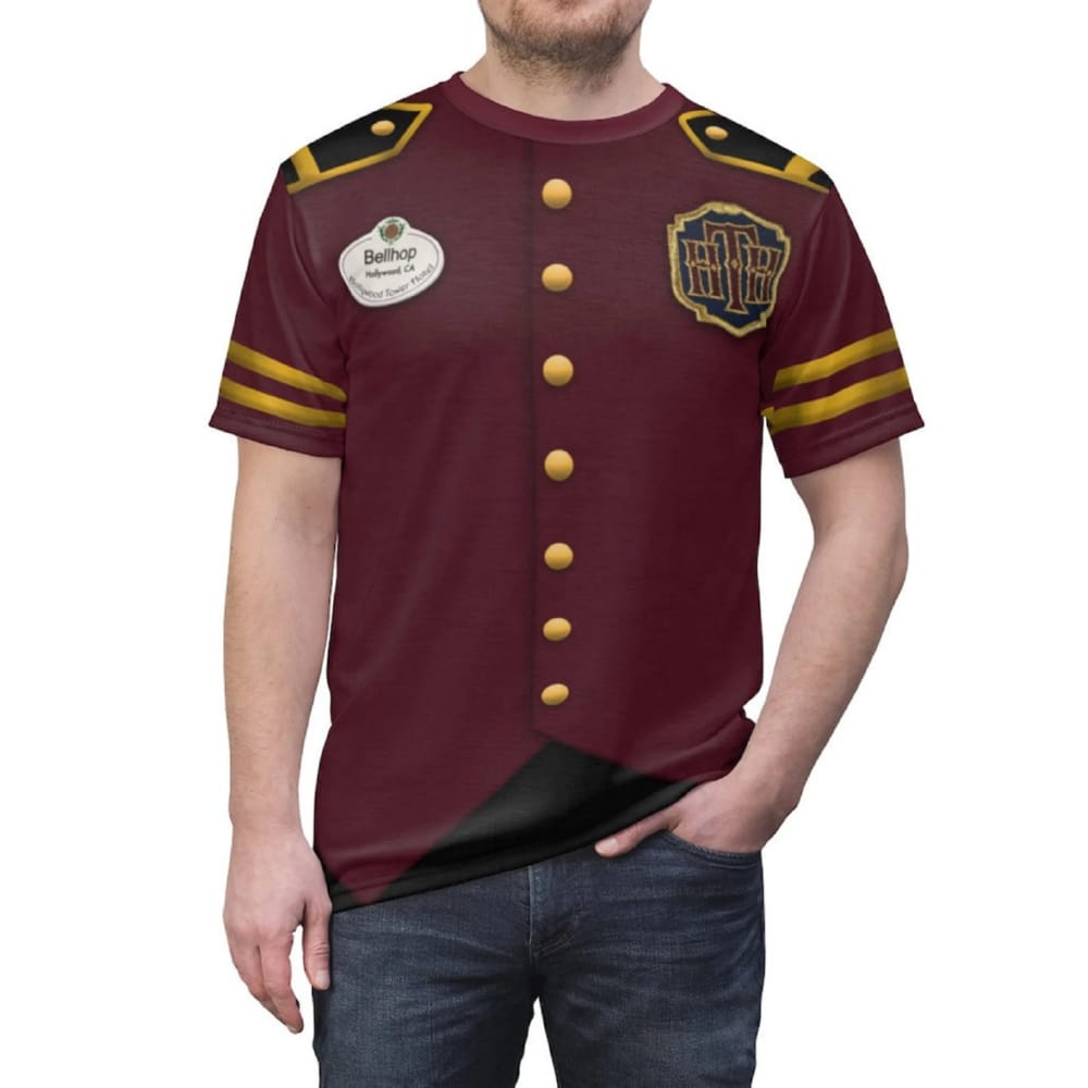 Drawing inspiration from the infamous bellhop uniforms of the Hollywood Tower Hotel, this shirt features all the vintage details that make the character so unforgettable. From the gold-striped sleeves to the brass buttons and intricate patches, every element is meticulously designed to evoke the haunted elegance of the Tower’s bellhops. Its hauntingly charming design captures the spirit of the ride and makes it a perfect choice for fans of both Disney history and spooky attire.