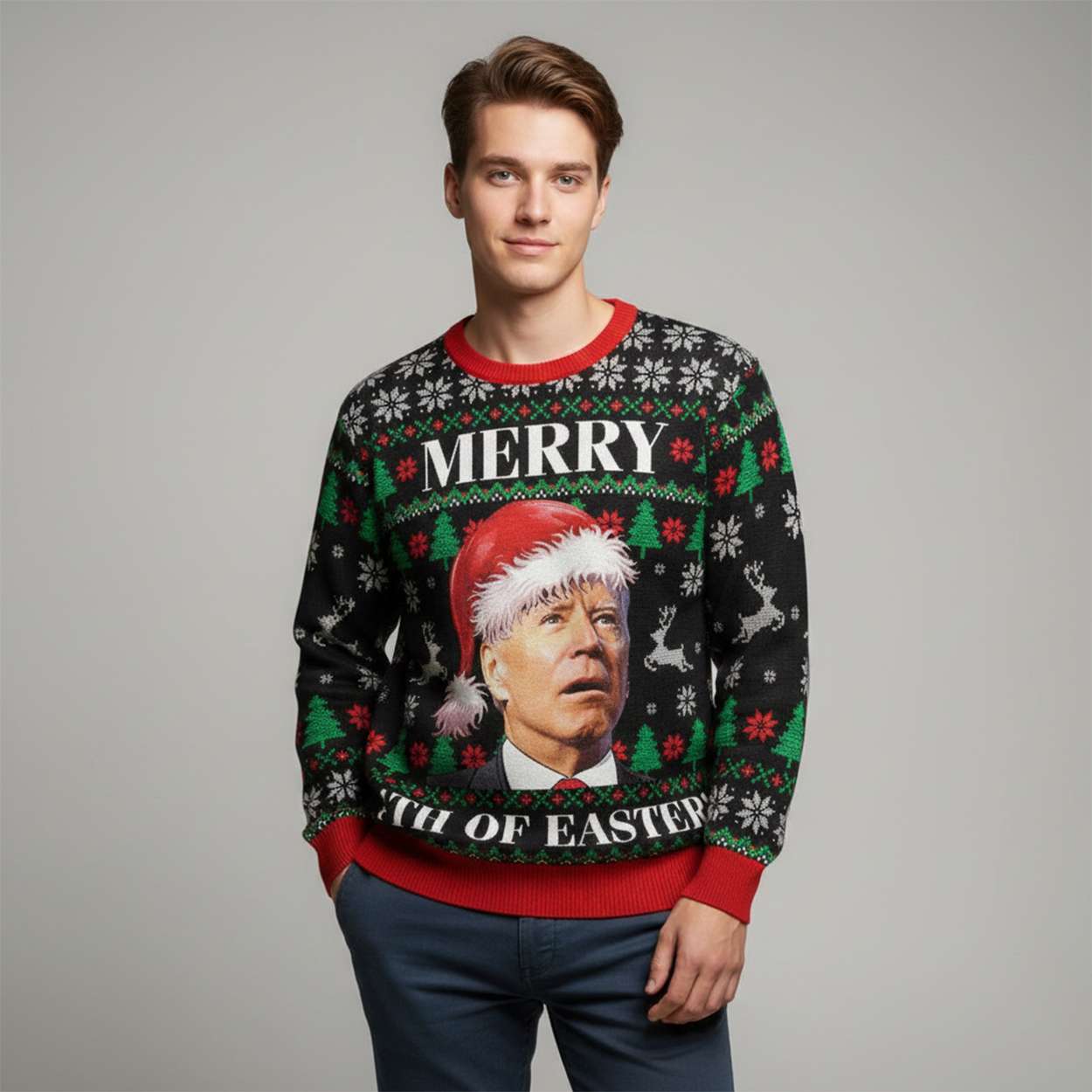 This sweater features President Joe Biden in a Santa hat, paired with the phrase “Merry 4th Of Easter,” a humorous mashup that echoes viral internet moments. It playfully nods to public gaffes and the meme culture surrounding modern political discourse.