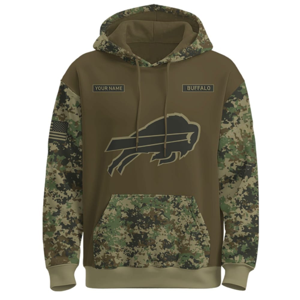 Incorporating the distinctive Buffalo Bills logo alongside military-inspired camouflage, the hoodie celebrates both sportsmanship and the enduring spirit of the Army. The “Bills” inscription highlights the pride that comes with being part of this storied franchise, while the camouflage sleeves give a nod to the Army’s iconic uniform, bridging the gap between civilian and military life. This hoodie speaks to the shared values of perseverance and dedication.