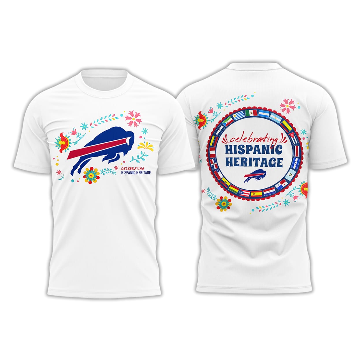 This shirt showcases the powerful Buffalo Bills emblem surrounded by radiant floral patterns inspired by Latin American artistry. Every detail tells a story of passion, resilience, and shared pride, echoing the rhythm of heritage that thrives across generations.