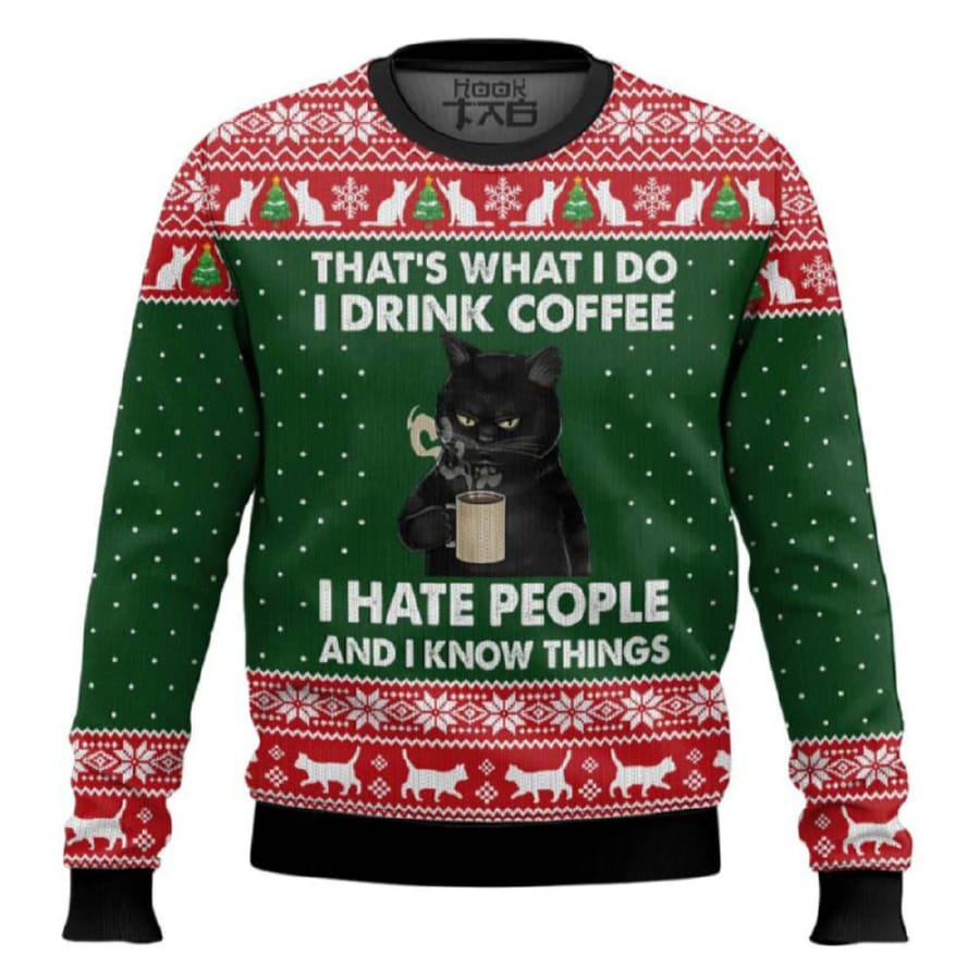 Unleash your inner introvert with the Black Cat That’s What I Do I Drink Coffee I Hate People And I Know Things Ugly Christmas Sweater. Featuring a coffee-loving feline and bold text, this design taps into modern sarcasm, pop culture, and the timeless allure of cats. Perfect for those who value wit over cheer.
