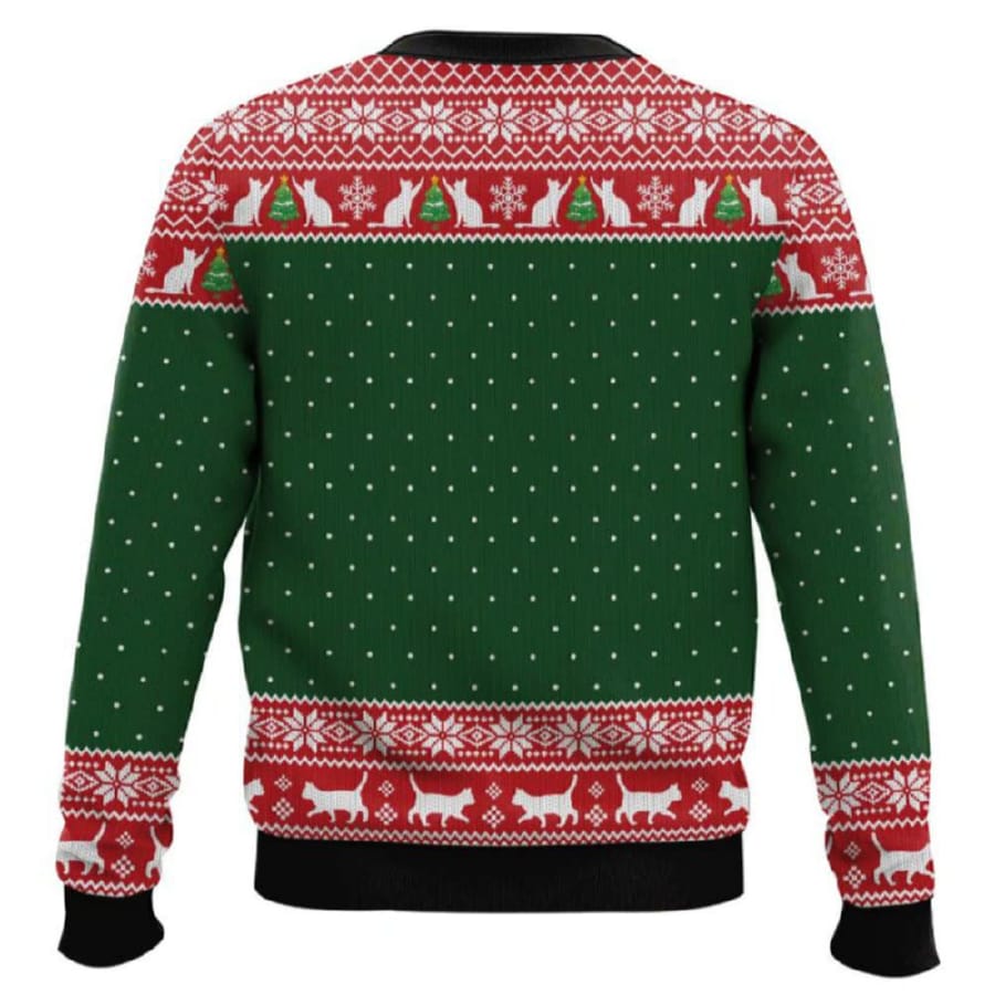 This sweater stars a black cat with a mug in paw and a glare that could curdle eggnog. Cats have long symbolized independence and mystery—this one adds caffeine and contempt, echoing the internet’s obsession with feline personalities that mirror our own moods.