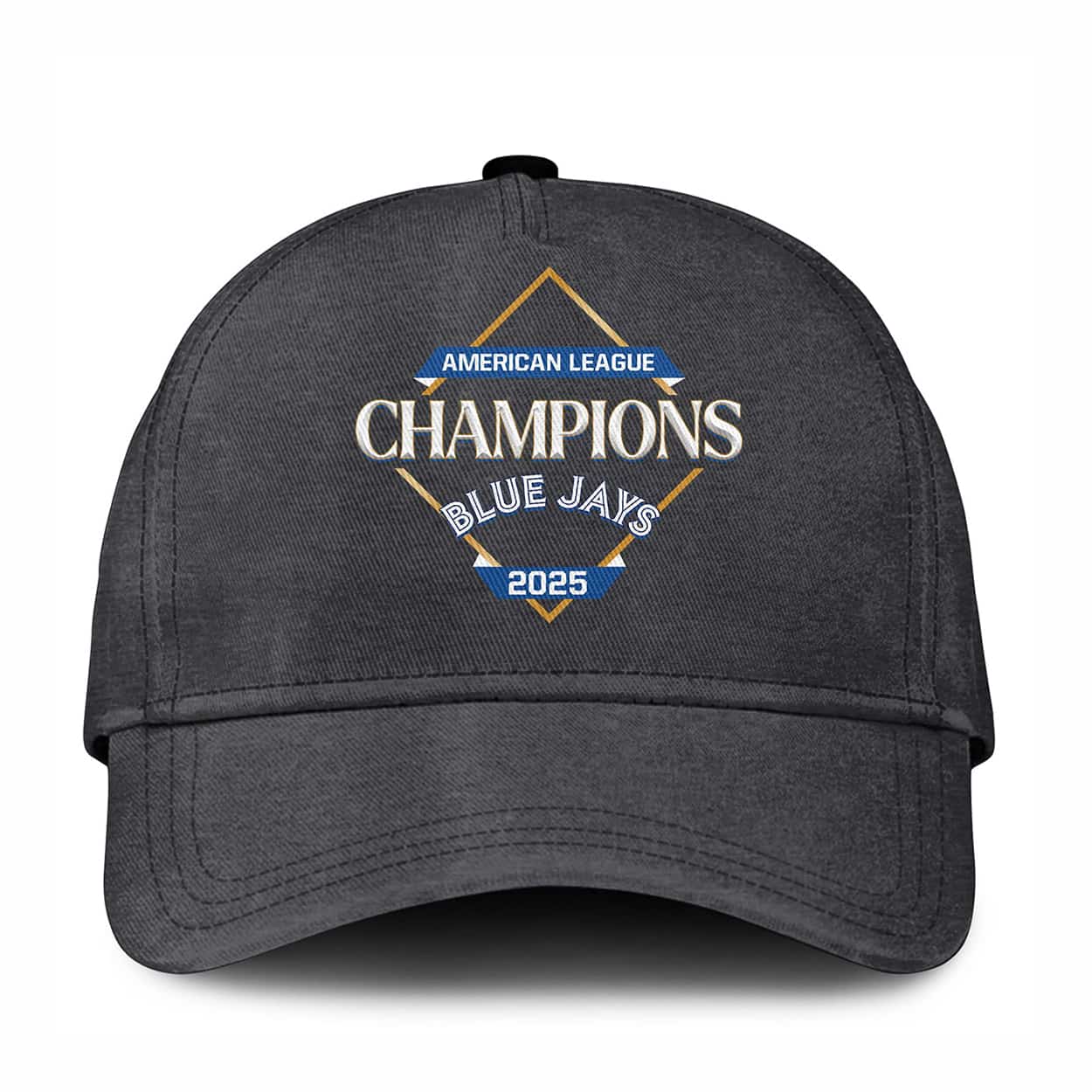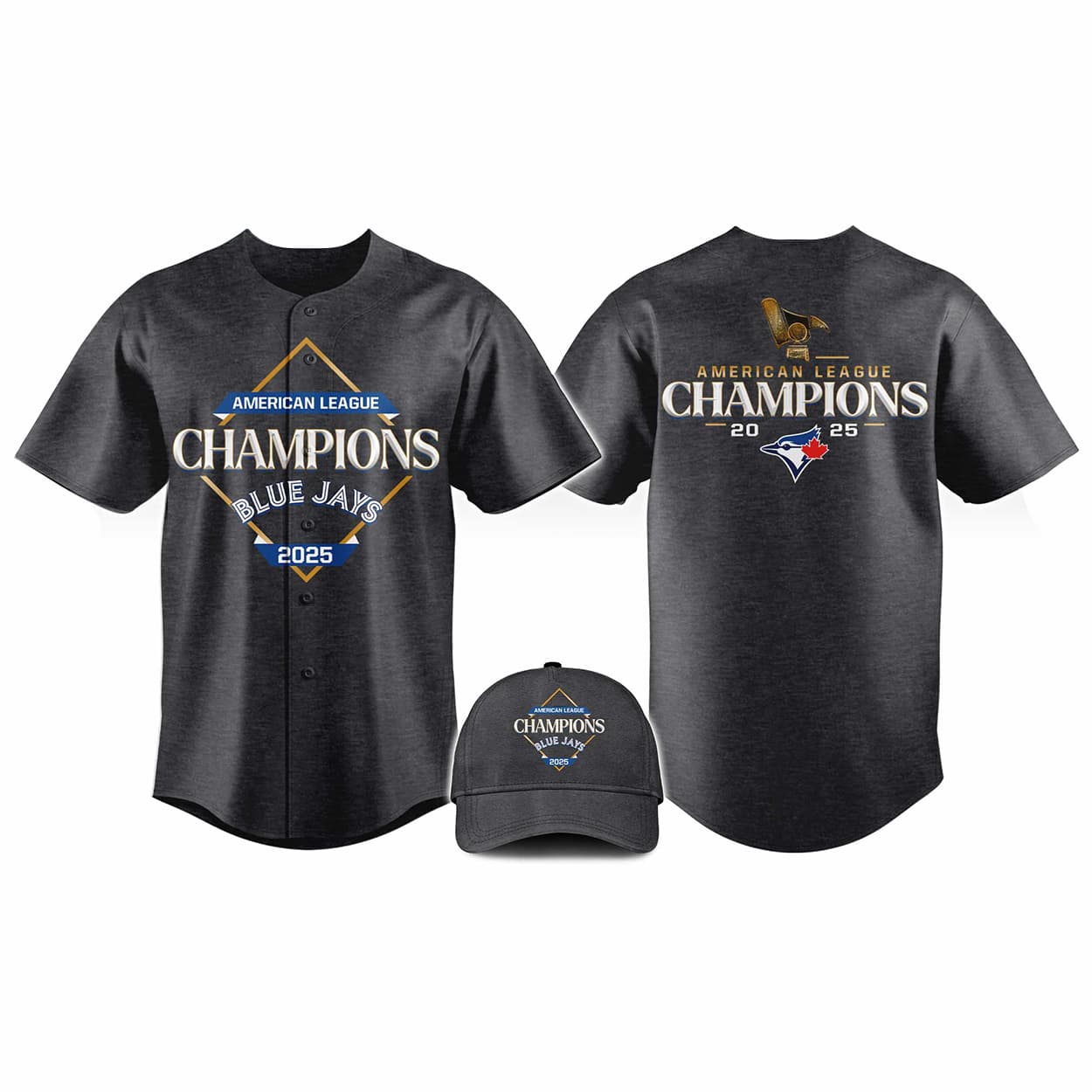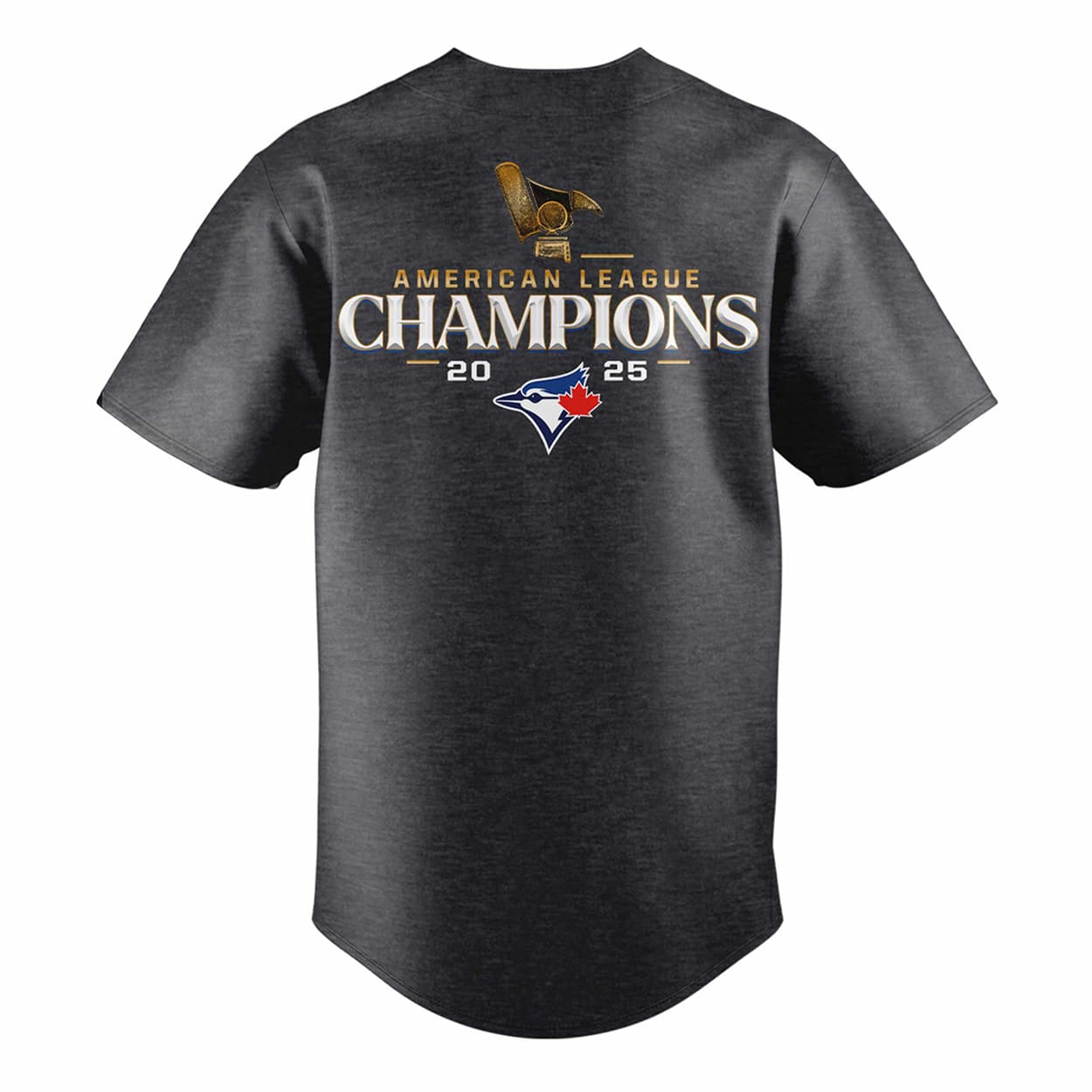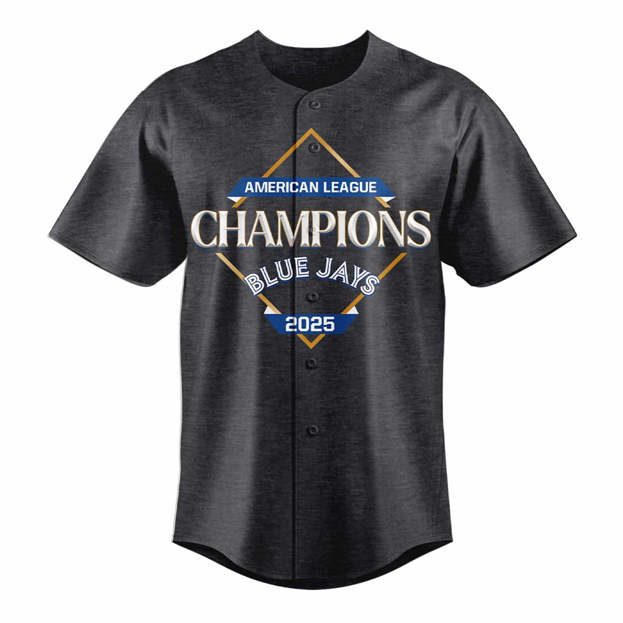 - Front Graphic: A prominent diamond shield graphic proudly displays “AMERICAN LEAGUE CHAMPIONS BLUE JAYS 2025” in bold typography.