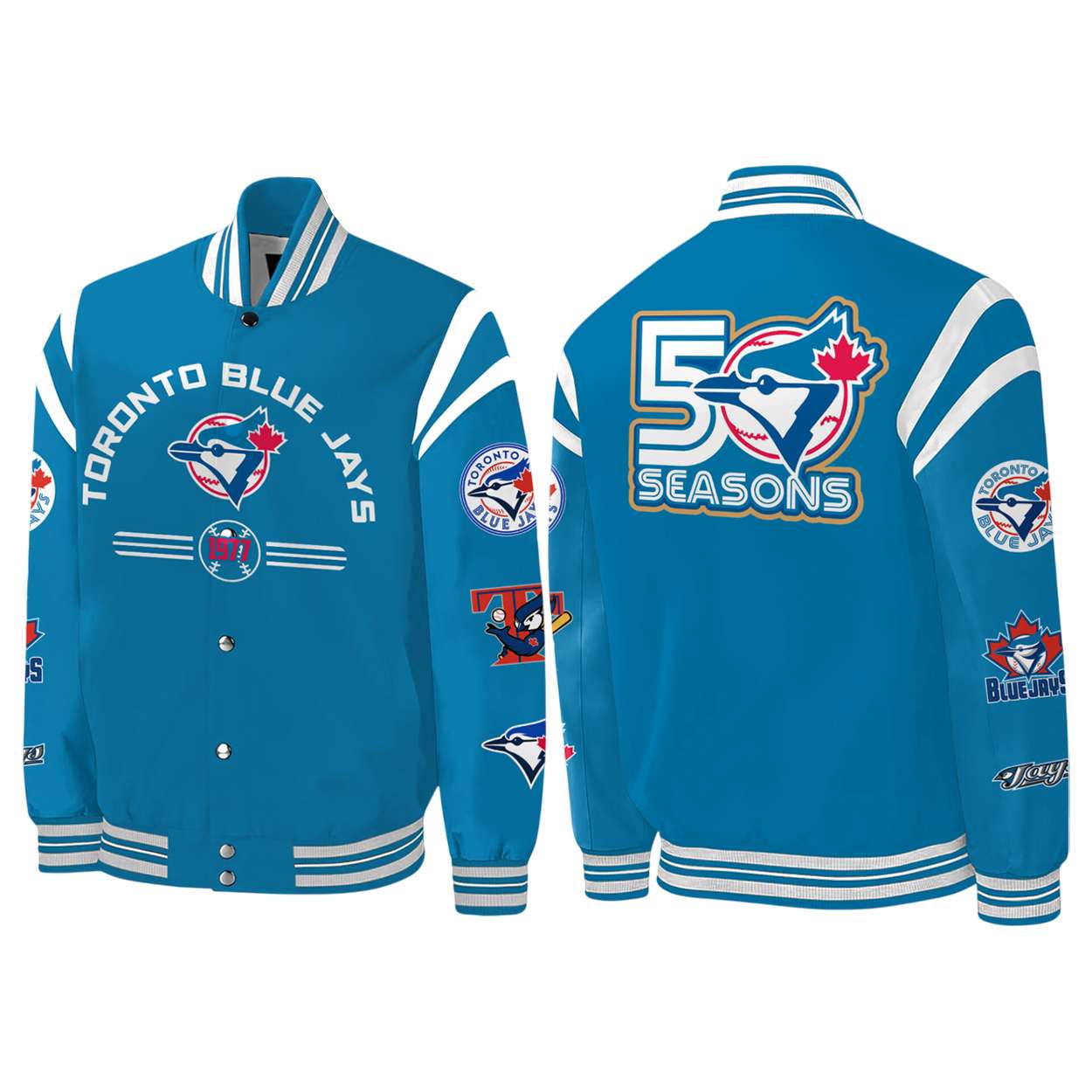 On the back, the bold “50 Seasons” graphic anchors the jacket in legacy. It’s more than apparel—it’s a tribute to fans, players, and the city of Toronto, where baseball became a symbol of unity, resilience, and cultural identity.