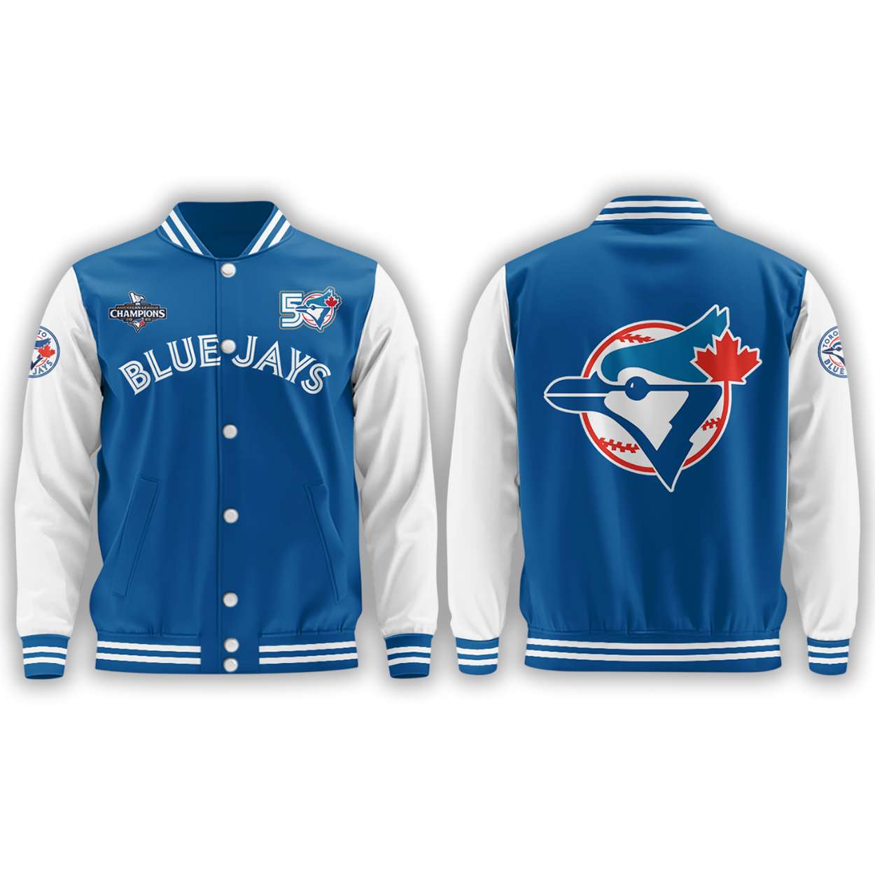 Honor five decades of Toronto Blue Jays legacy with the Blue Jays 50th Anniversary Baseball Jacket. Featuring iconic patches and historic emblems, this jacket connects fans to unforgettable moments, legendary players, and the enduring spirit of Canadian baseball culture.