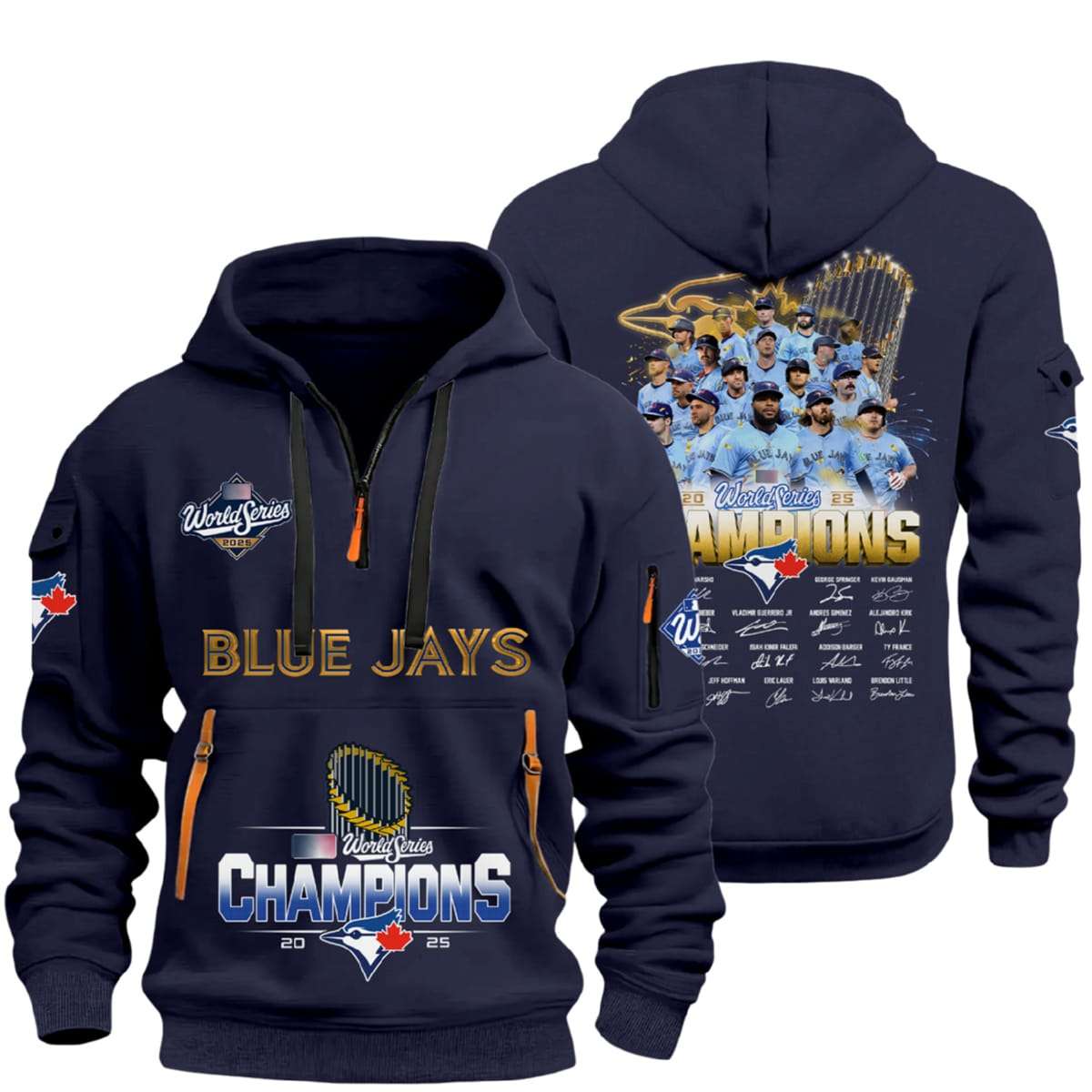 Relive the Blue Jays’ epic 2025 World Series victory with this Blue Jays World Series Champions 2025 Quarter Zip Hoodie. Featuring game-by-game highlights, player autographs, and a team photo, it’s a tribute to one of baseball’s most thrilling championship runs.