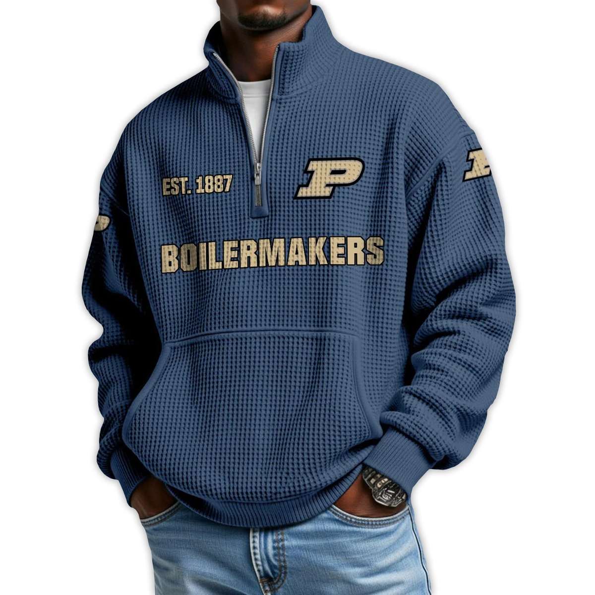 Honor Purdue’s football legacy with the Boilermakers Football Est 1887 Waffle Stand Collar Half Zip Sweatshirt. Featuring bold graphics and historic emblems, this pullover connects fans to iconic players, landmark seasons, and the enduring grit of West Lafayette’s proud tradition.