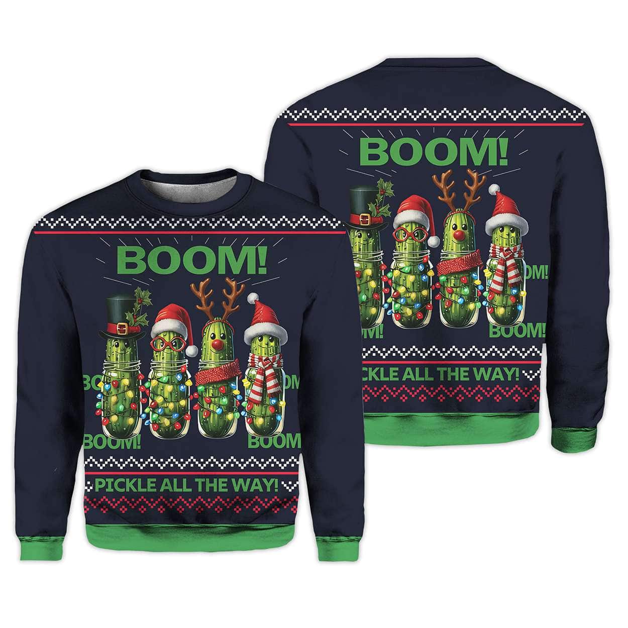Unleash holiday humor with the Boom Pickle All The Way Ugly Christmas Sweater! Featuring festive pickles in quirky attire, this sweater blends seasonal cheer with playful satire. Perfect for those who love bold fashion and a dash of social commentary.