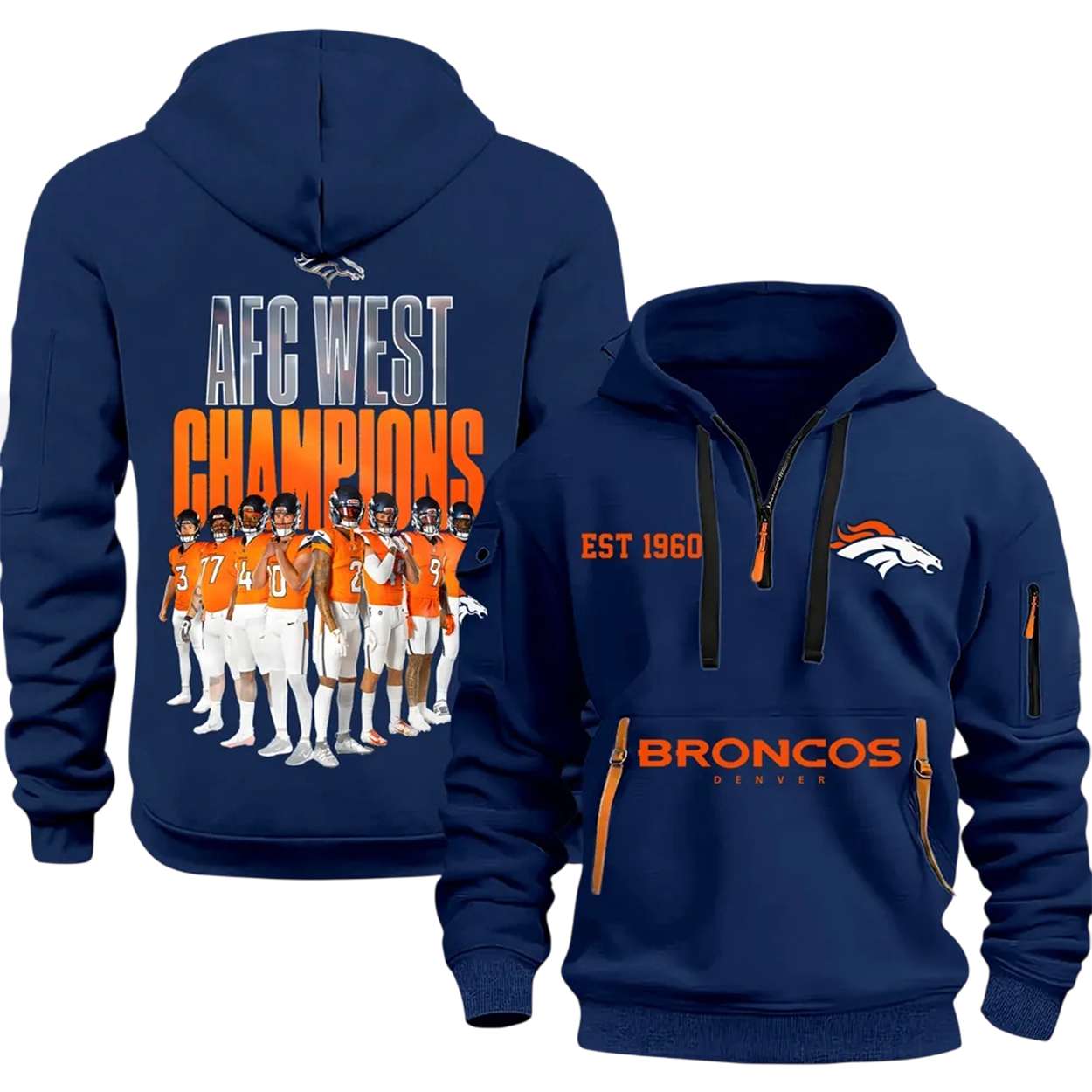 Honor Denver’s return to dominance with the Broncos 2025 AFC West Champions Quarter Zip Hoodie. Featuring bold graphics and historic context, this hoodie pays tribute to Bo Nix, Sean Payton, and the team’s first division title since 2015—a symbol of grit and revival.