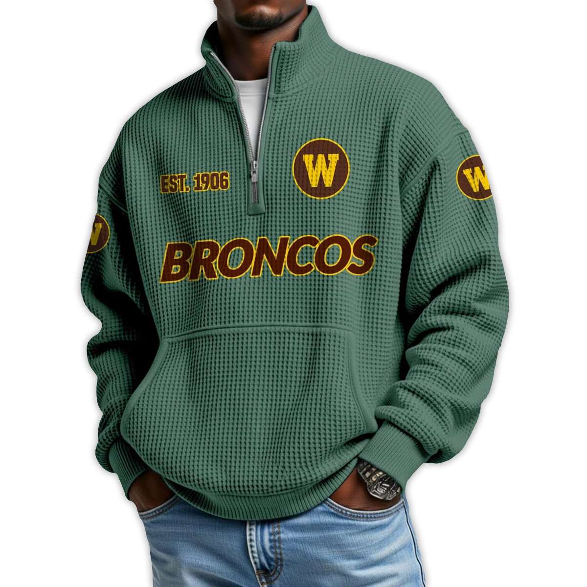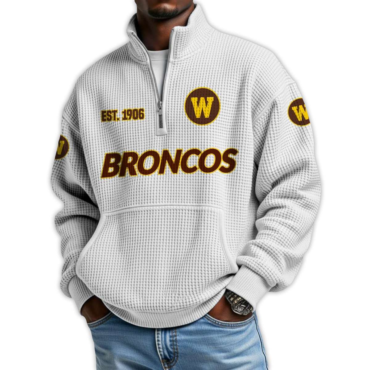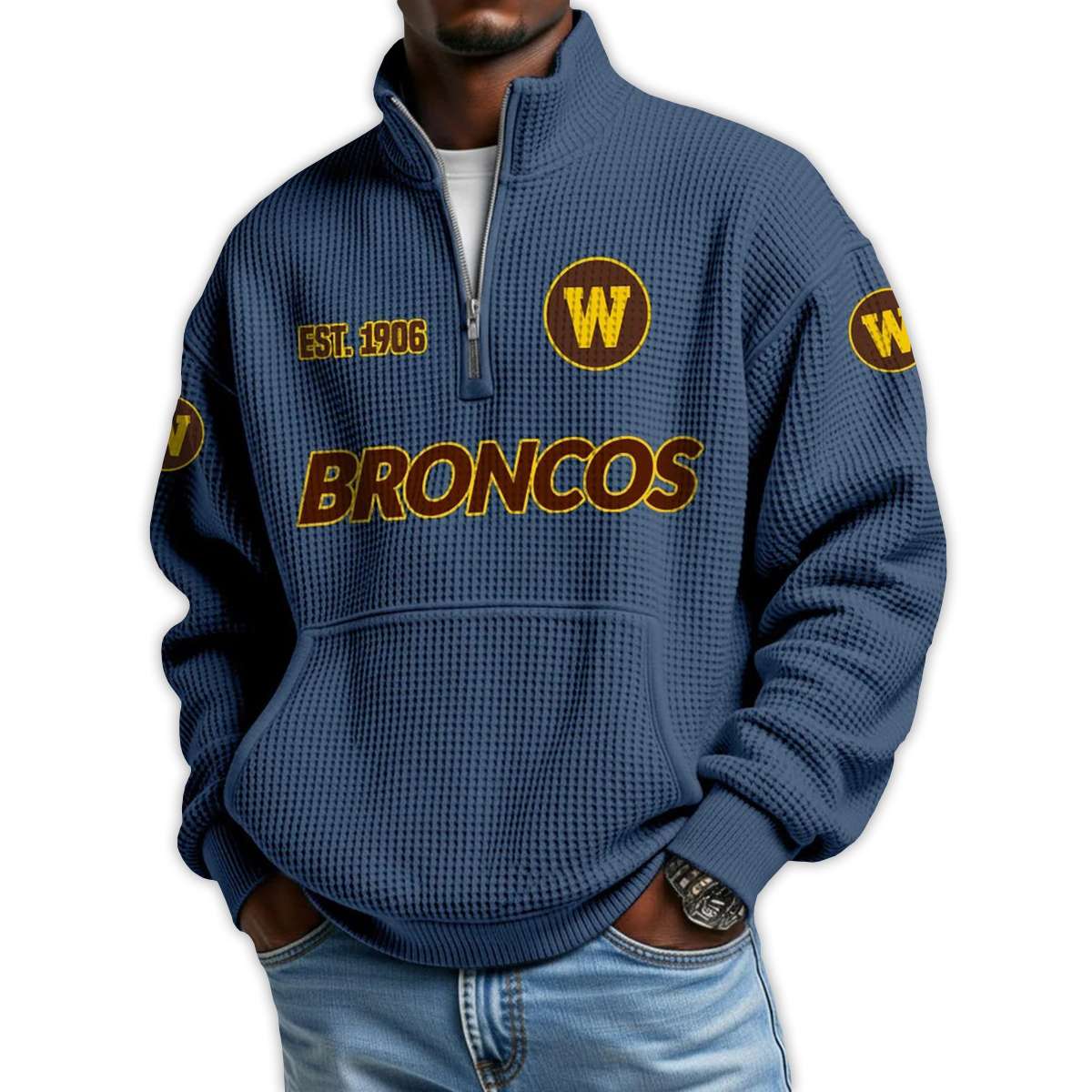 Show your pride in Western Michigan’s football legacy with the Broncos Football Est 1906 Waffle Stand Collar Half Zip Sweatshirt. Featuring bold team graphics and historic nods, this piece connects fans to iconic players, regional pride, and the enduring spirit of Kalamazoo.