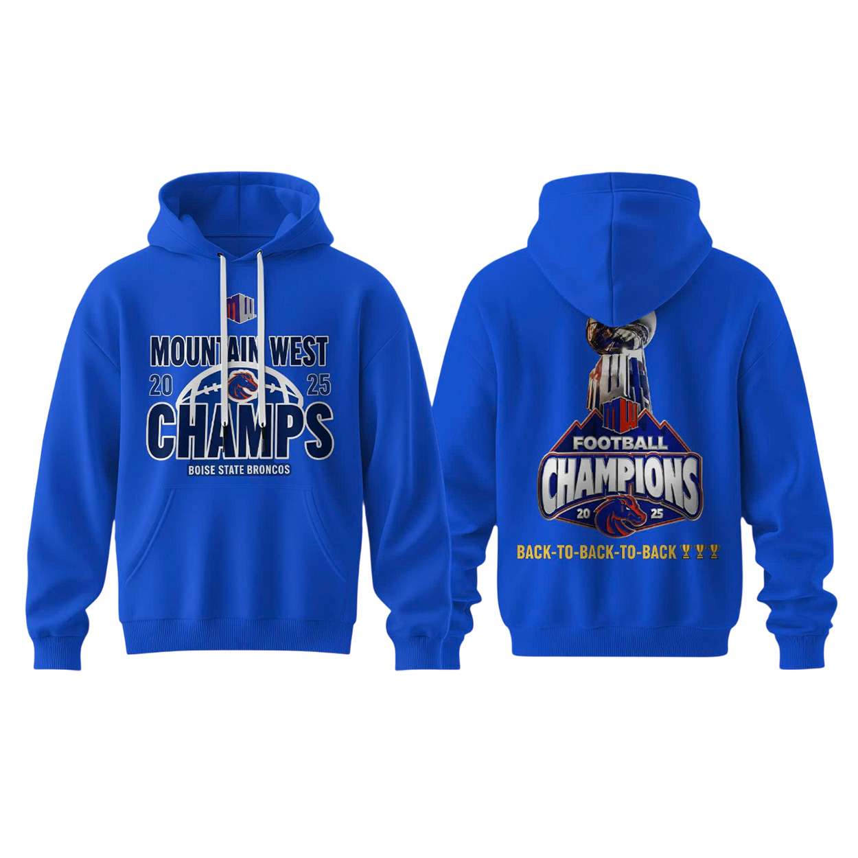 Show your pride in Boise State’s 2025 Mountain West football dominance with this Broncos Mountain West Champs 2025 Hoodie. Featuring championship graphics and a triple-trophy design, it honors a legacy of grit, leadership, and back-to-back-to-back victories that electrified the conference.