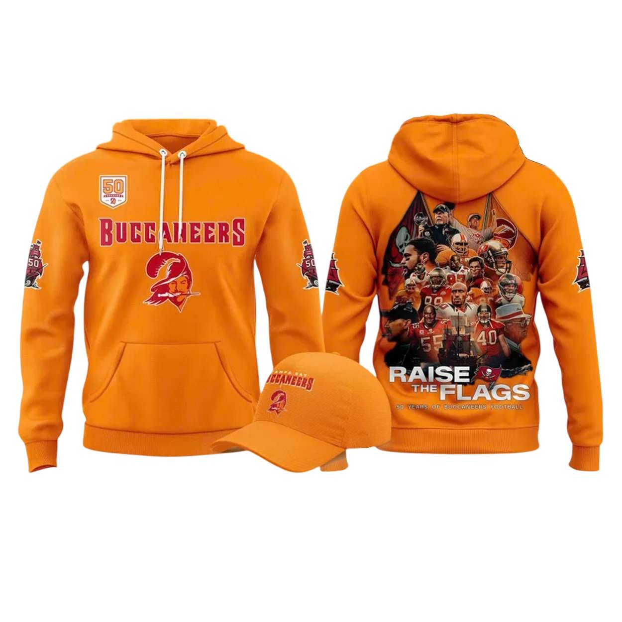 Honor five decades of gridiron grit with the Buccaneers 50th Season Raise The Flags Hoodie. Featuring iconic player imagery and bold graphics, this hoodie pays tribute to Tampa Bay’s football legacy and the enduring passion of its loyal fanbase.