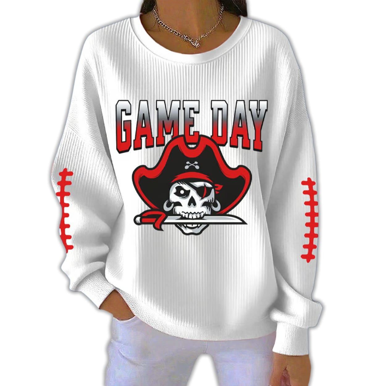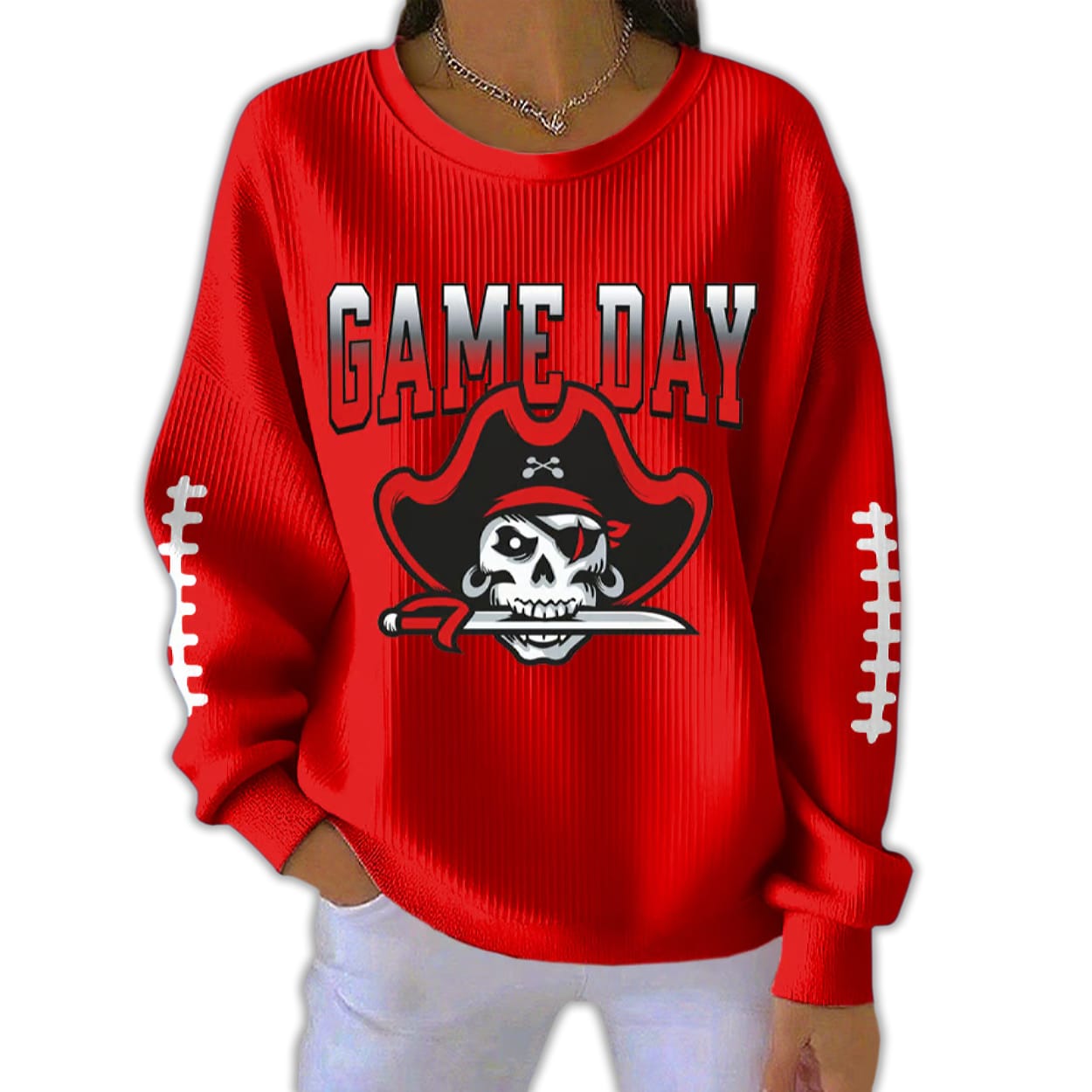 The bold red color recalls the courage of the Tampa Bay Buccaneers and the fire of unity that fuels modern fandom. This sweatshirt connects stadium roars to the rebellious spirit of pirate history—where teamwork, trust, and risk defined every victory.