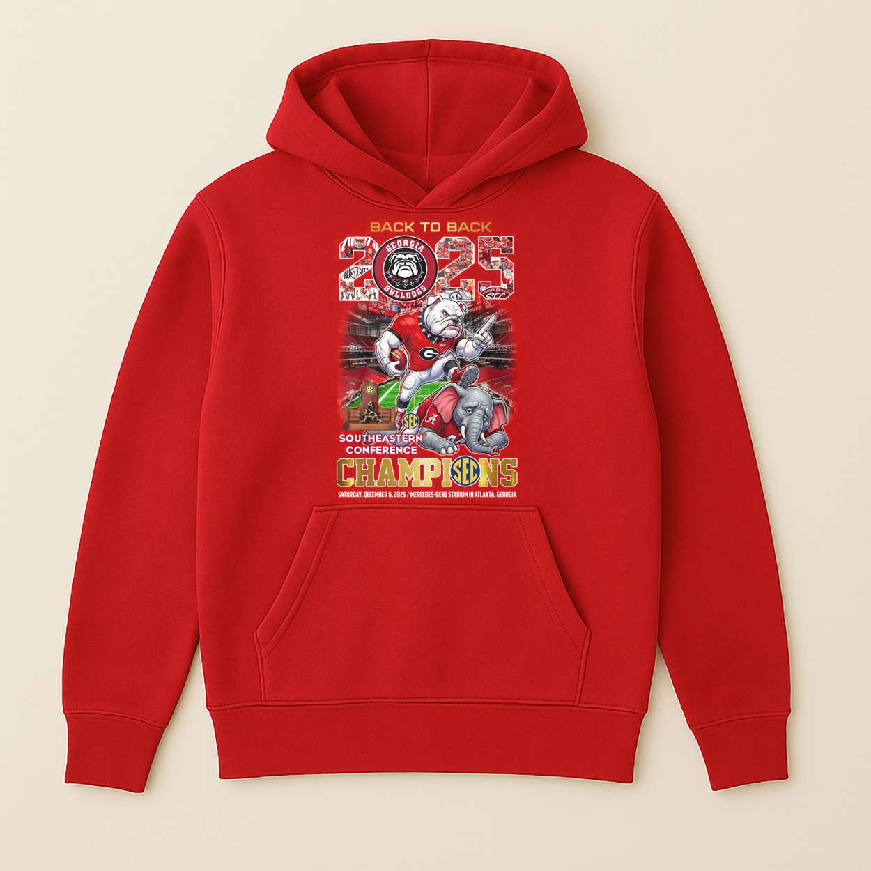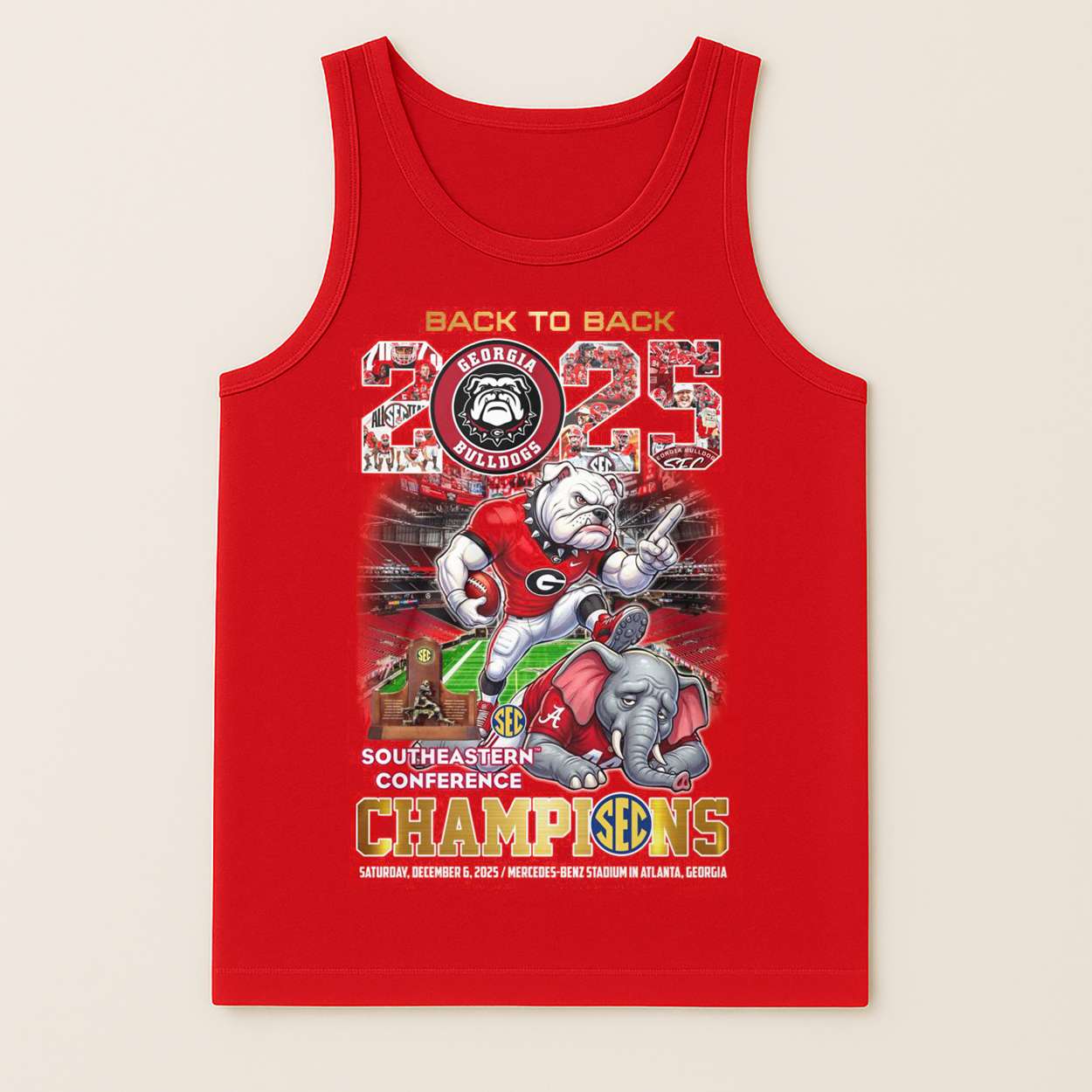 The shirt immortalizes the showdown at Mercedes-Benz Stadium, where Georgia’s tactical brilliance and unwavering spirit secured their place in history. Fans remember the roar, the tension, and the moment the tide turned red—etched forever in collegiate lore.