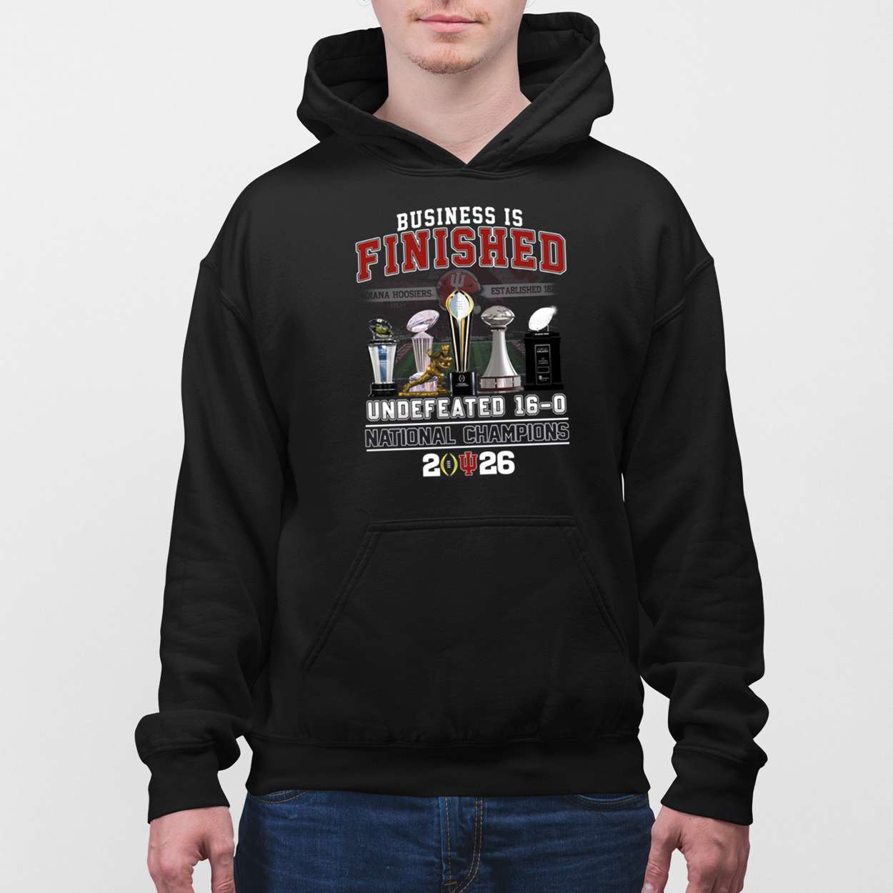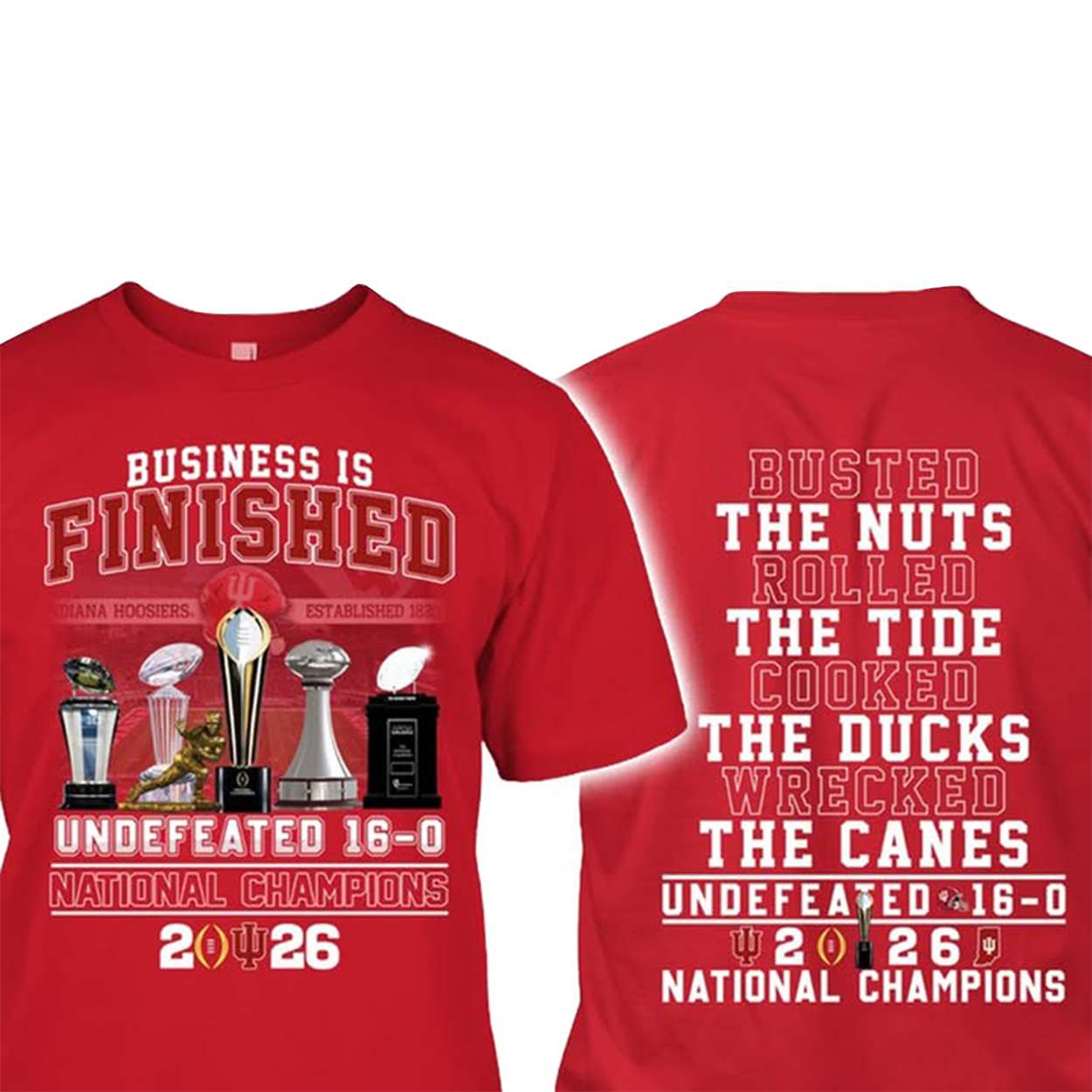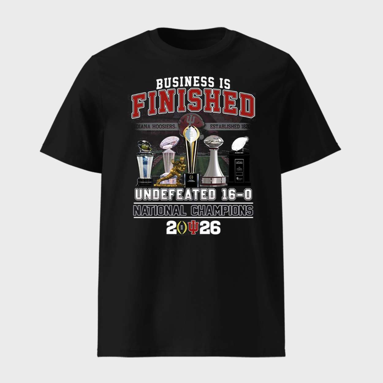 The phrase “Business Is Finished” echoes the team’s relentless mindset. From preseason whispers to postseason roars, the Hoosiers silenced doubters and forged a legacy. Trophy icons on the front symbolize their sweep of major titles, a visual testament to their supremacy.