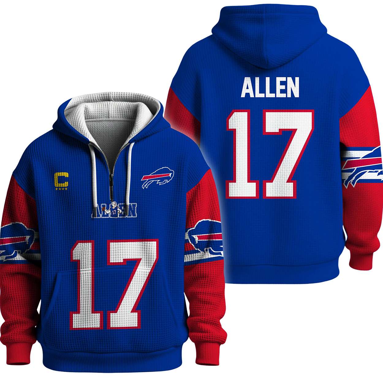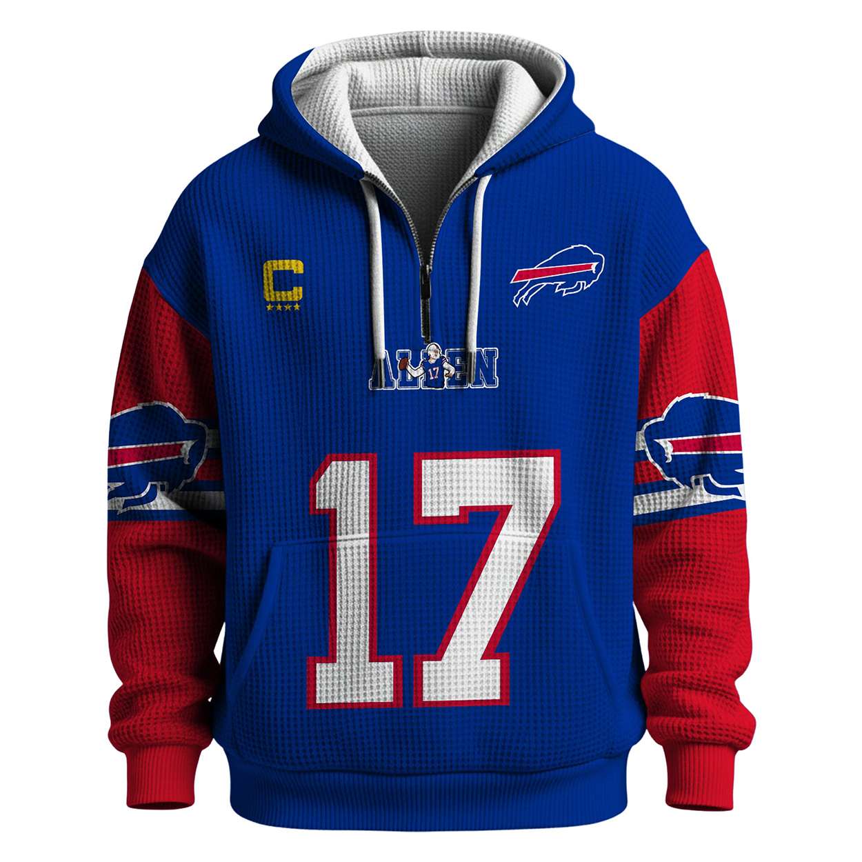 Command attention with the Captain Allen 17 Bills Quarter Zip Waffle Hoodie. Featuring Josh Allen’s name, number, and captain patch, this hoodie honors Buffalo’s rising star and the city’s enduring grit through iconic visuals and powerful football heritage.