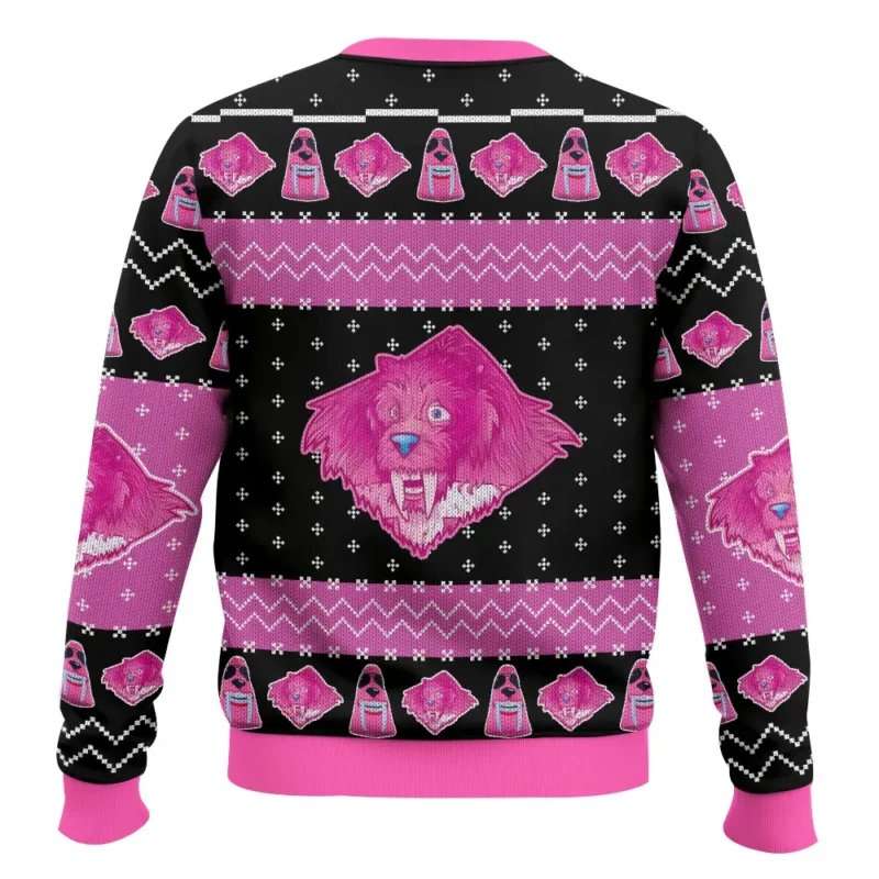 Booster, the unforgettable pink saber-toothed tiger from Jingle All The Way, takes center stage in this audacious sweater. Known for his outlandish design and fiery energy, Booster has long been a cult figure among fans who admired his wild presence beyond the film’s original comedic setting.
