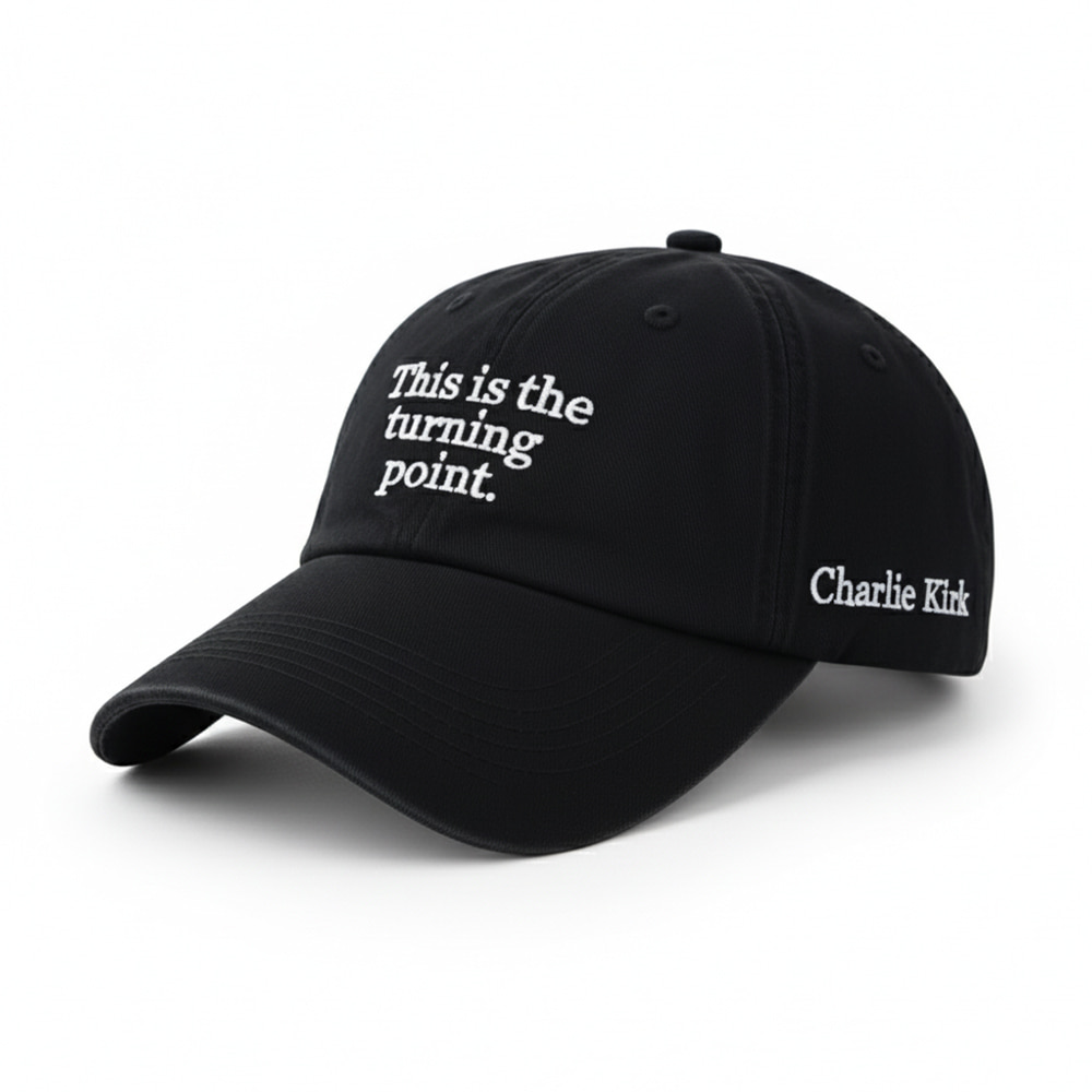 This baseball cap features crisp embroidery reading “This is the turning point” across the front panel, with “Charlie Kirk” stitched on the side. Crafted from durable cotton twill, it boasts stitched eyelets for ventilation, a curved brim for sun protection, and an adjustable strap for a custom fit. Wearers don it at campus rallies, memorial gatherings, and everyday outings to show solidarity with the movement he built and to spark conversations about civic engagement.