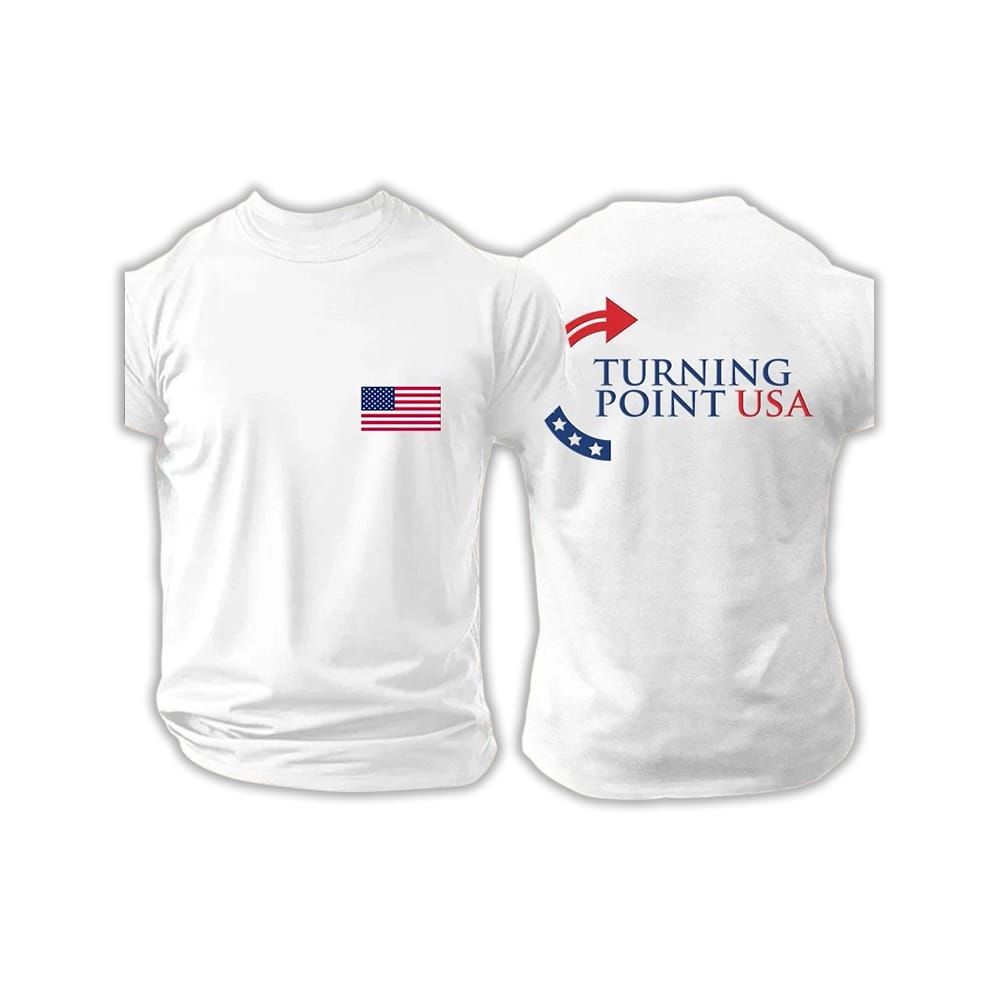 The Charlie Kirk Turning Point USA Two-Sided Shirt features bold symbols representing American patriotism and conservative youth activism. The front showcases the USA flag, while the back displays the Turning Point USA logo, embodying the spirit of political engagement and free speech.