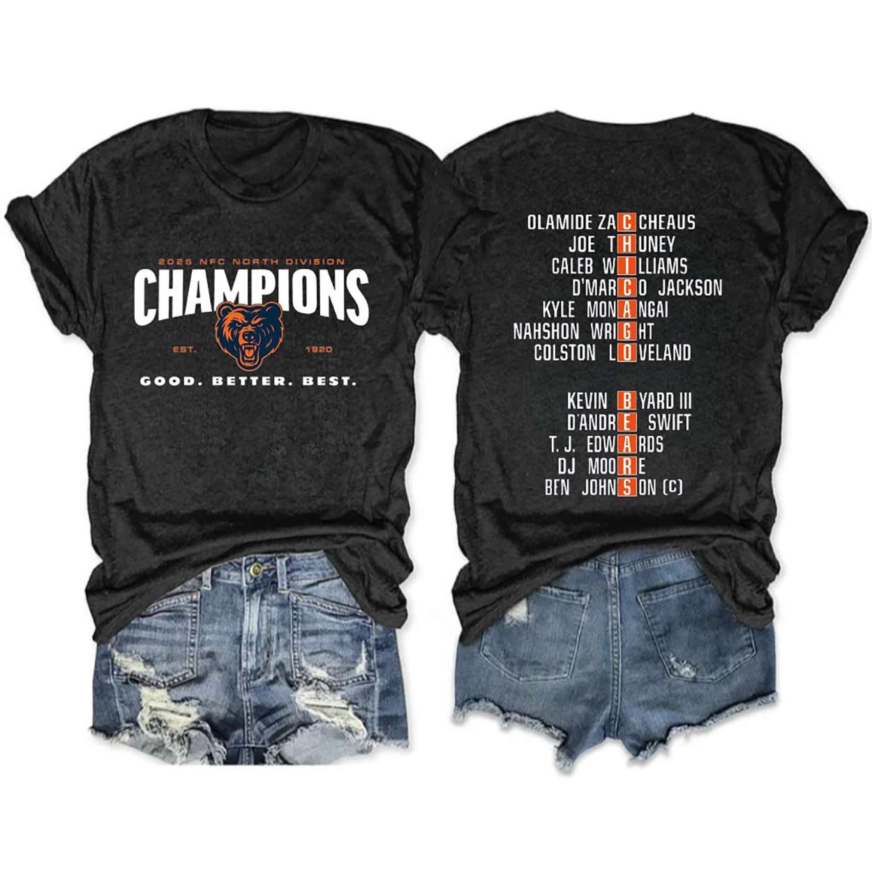 The front design declares “2025 NFC North Champions” with the slogan “GOOD. BETTER. BEST.” and a fierce bear logo. It marks a season led by Caleb Williams, whose poise and precision revived Chicago’s offense and reignited hope across Soldier Field.