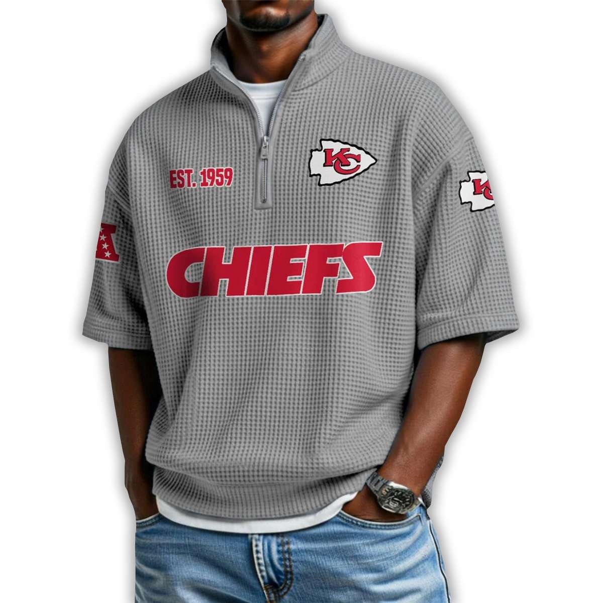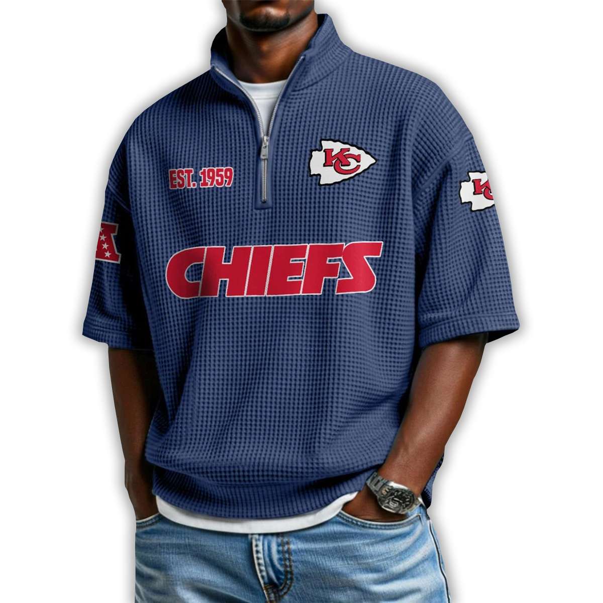 Show your Kansas City pride with the Chiefs Est 1959 Waffle Stand Collar Half Zip Polo Shirt. Featuring bold graphics and historic emblems, this shirt connects fans to legendary players, iconic moments, and the enduring strength of Midwestern football culture.