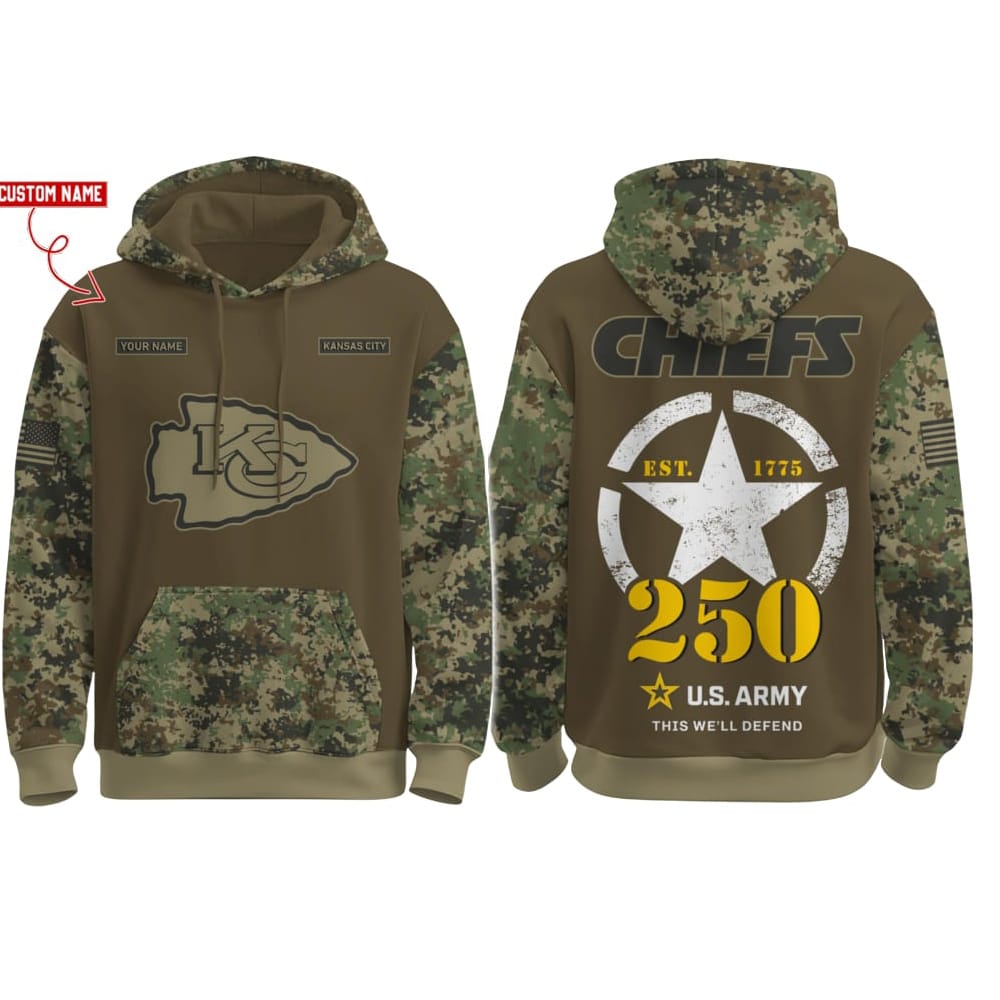 Get your Chiefs US Army 250th Birthday Celebration Hoodie 2025 and honor the legacy of Kansas City’s finest combined with the strength of the U.S. Army. Crafted with a distinctive camouflage design, this hoodie features custom personalization, historical elements, and military pride. Perfect for veterans, football fans, and patriots alike, it’s a unique way to show your support and connection to a storied past.