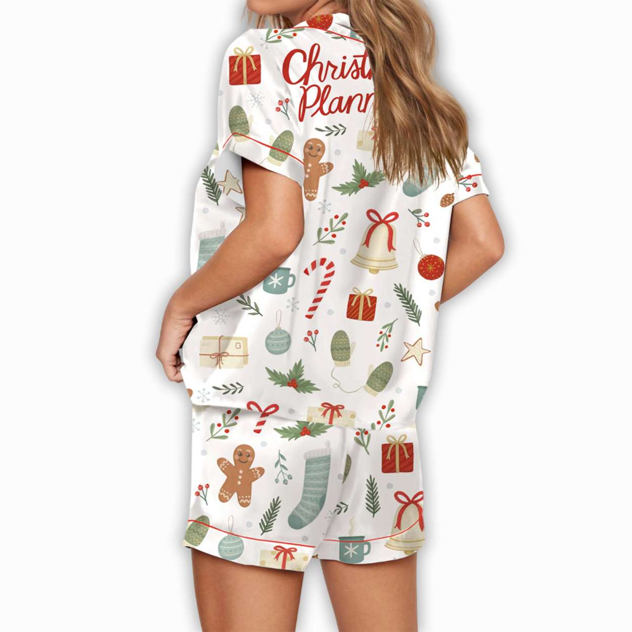Slip into the season with the Christmas Planner Silky Satin Pajama Set—a playful nod to holiday traditions, festive icons, and nostalgic winter charm. Featuring gingerbread men, candy canes, and stockings, it’s a cozy tribute to timeless Christmas storytelling and cultural warmth.