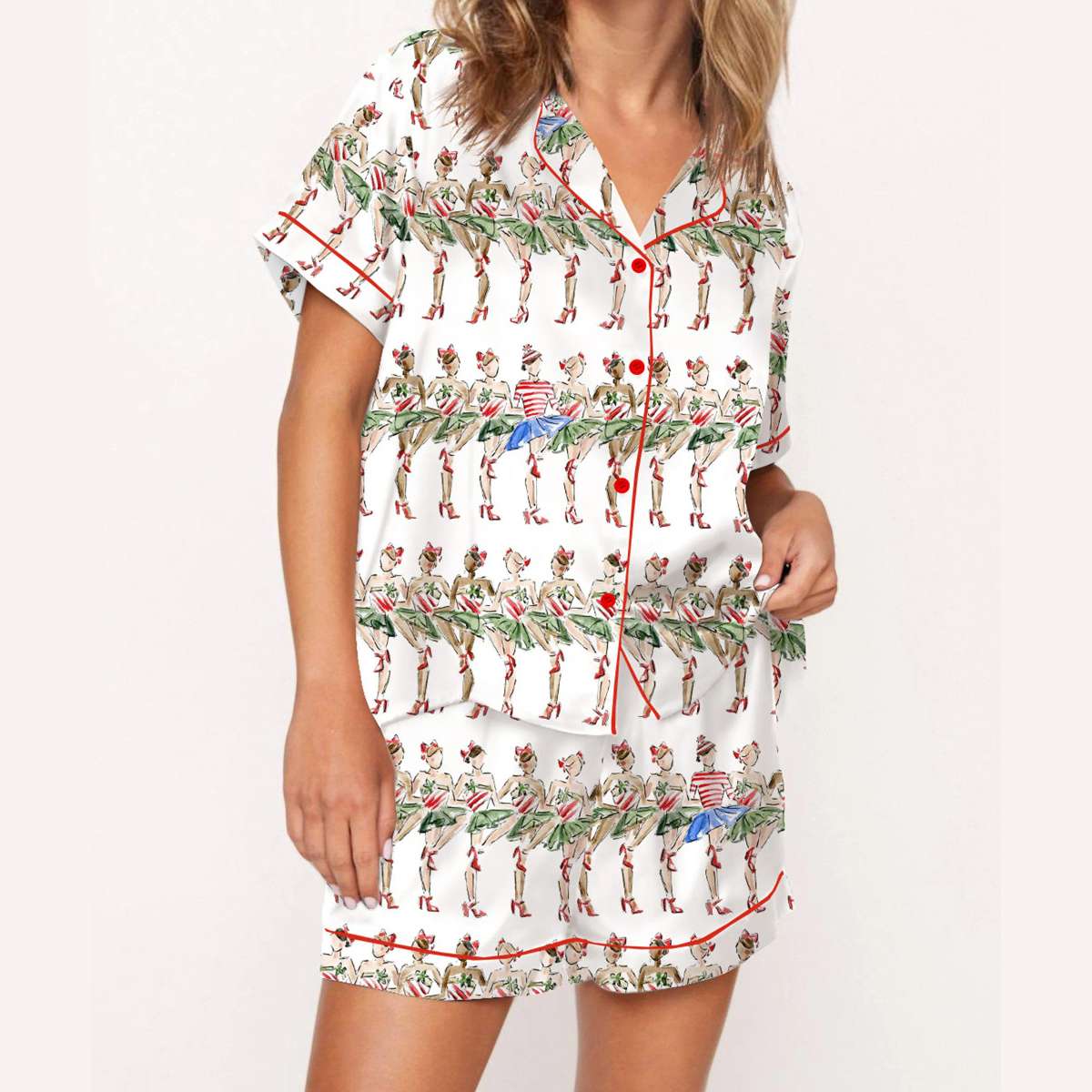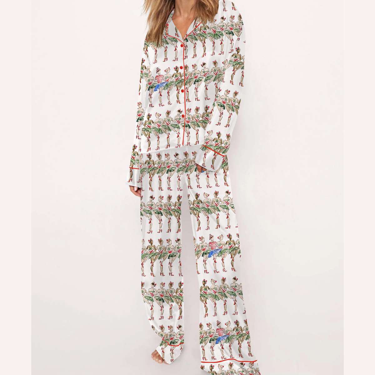 Channel the glamour of New York’s holiday season with the Christmas Radio City Rockette Silky Satin Pajama Set. Featuring vintage swimwear-inspired dancers and tropical flair, this design nods to the iconic Rockettes and their dazzling legacy of performance and empowerment.