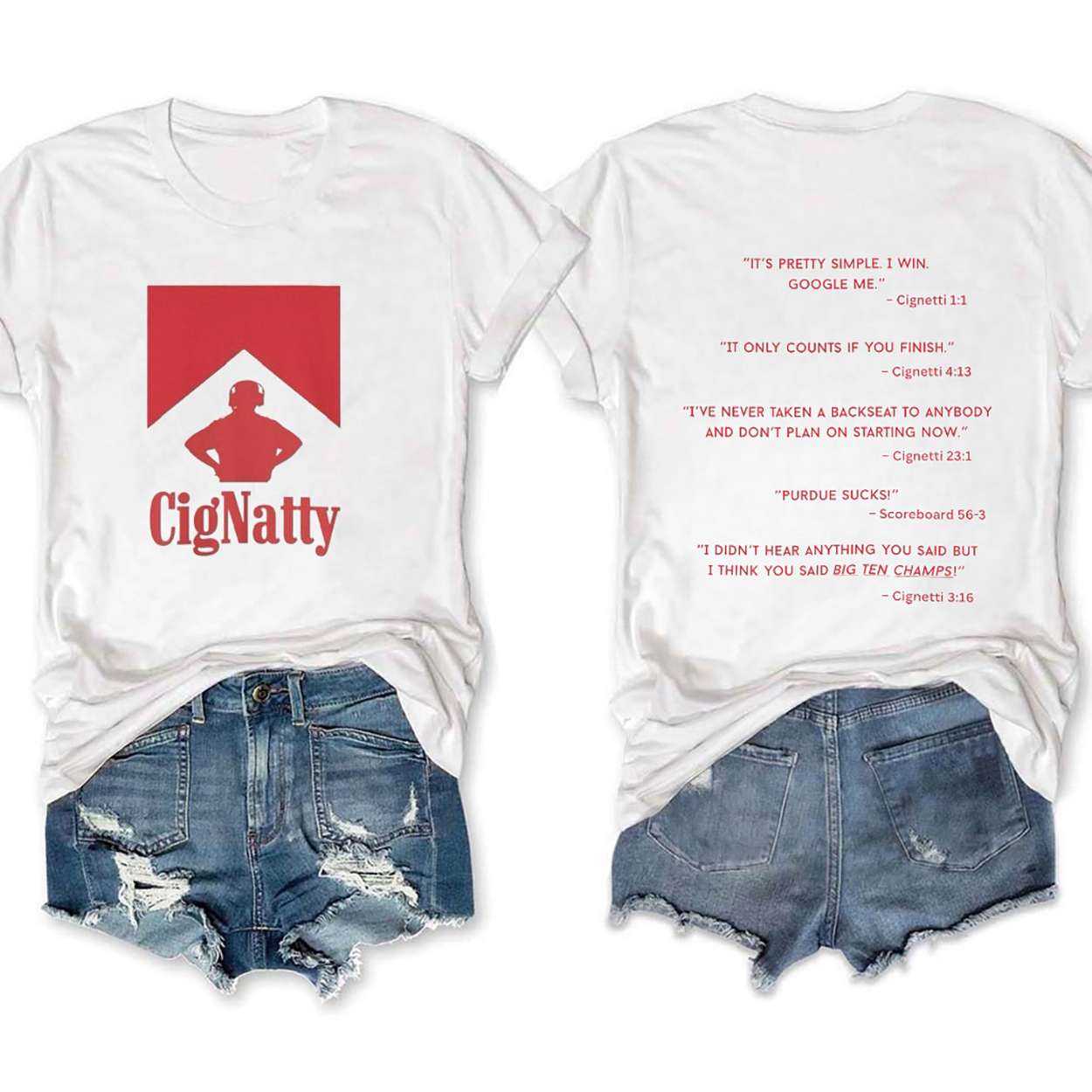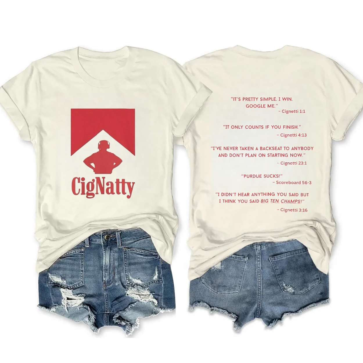 The front design showcases a confident figure beneath an upward arrow, symbolizing ambition and dominance. “CigNatty” pays homage to Coach Curt Cignetti, whose leadership style and unapologetic attitude have electrified Indiana football culture and sparked national attention.