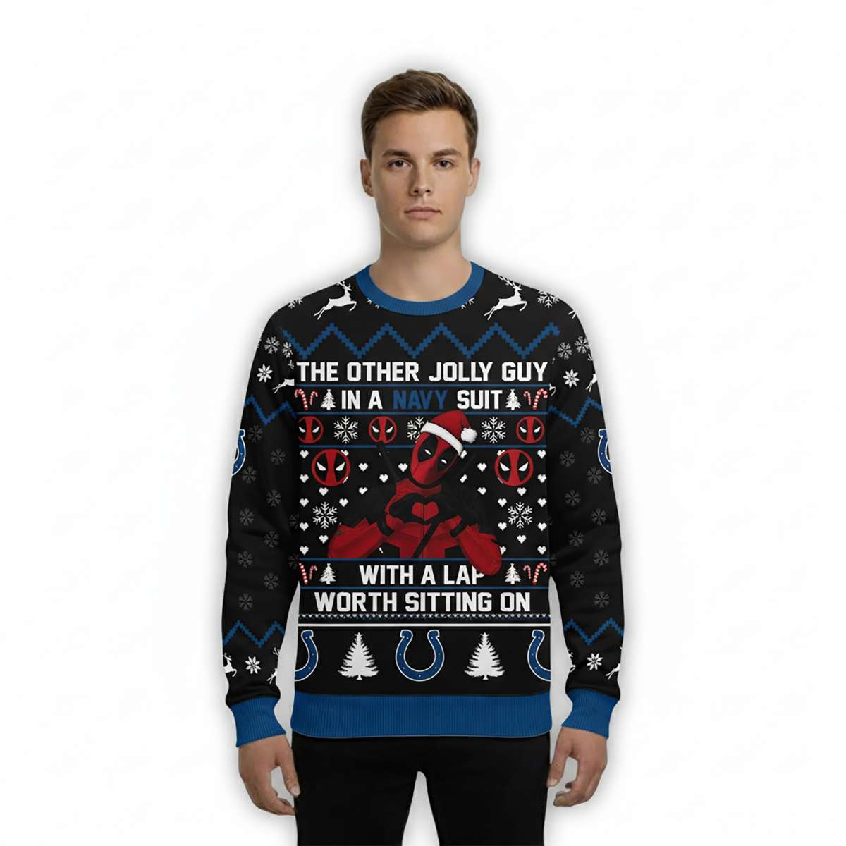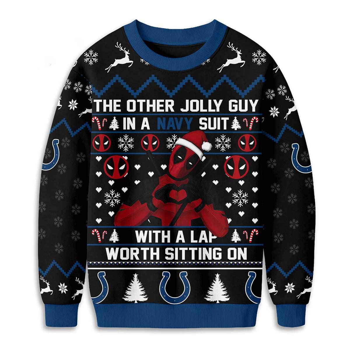 Deadpool’s chaotic charisma meets Colts fandom in this bold sweater, where the phrase “The Other Jolly Guy in a Navy Suit” flips tradition with a wink. His heart-shaped gesture and Santa hat add playful contrast to the team’s competitive spirit.
