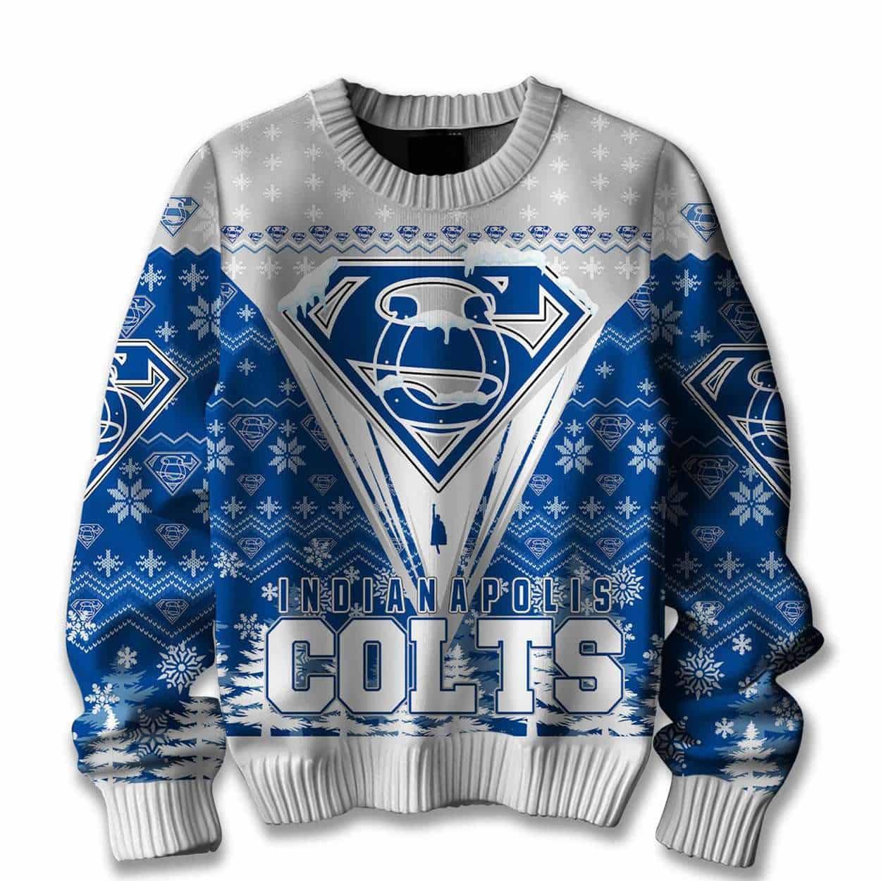 This sweater blends the Superman crest with the Colts’ emblem, symbolizing grit and gridiron glory. It’s a nod to the team’s unwavering strength and the city’s deep connection to football as a source of pride and unity.