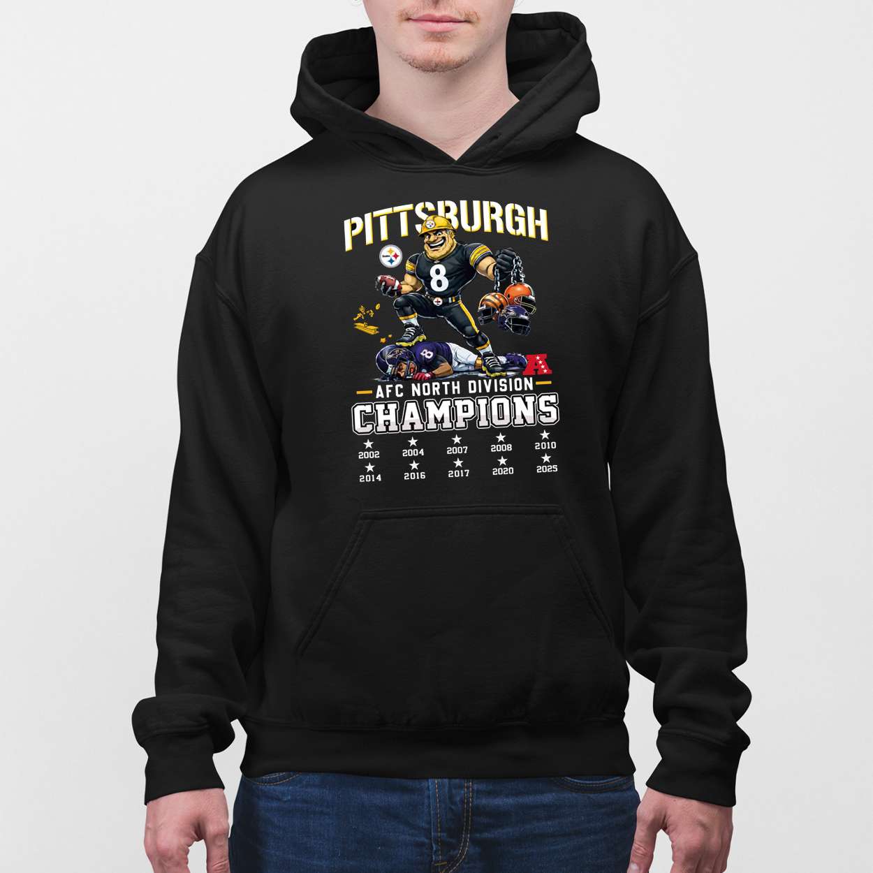 A fierce number 8 quarterback towers over rivals in this bold design, echoing Pittsburgh’s dominance in the AFC North. Each illustrated opponent reflects real division matchups, turning the shirt into a visual tribute to hard-fought victories and regional supremacy.