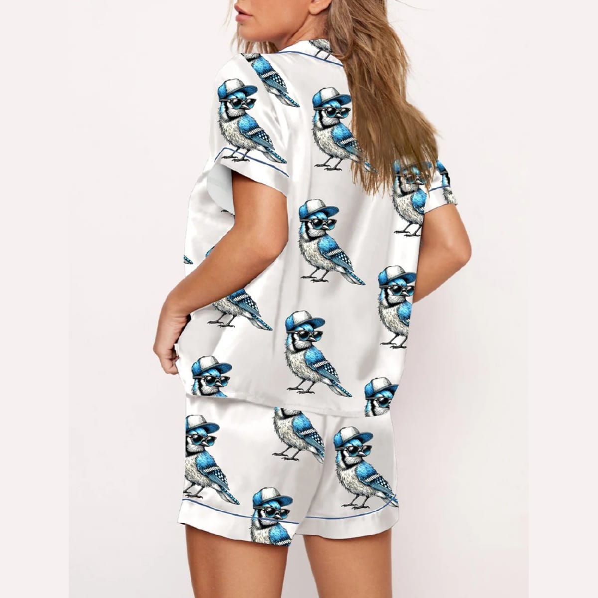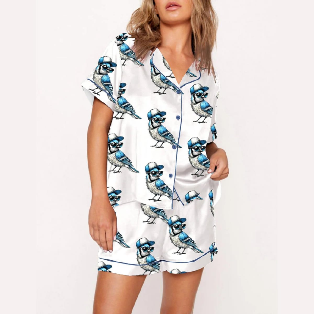 The Cool Blue Jay Bird Pajama Set features whimsical blue jays in caps and shades, channeling urban flair and avian attitude. Inspired by street culture and environmental symbolism, this playful design connects fashion with wildlife awareness and cultural storytelling.