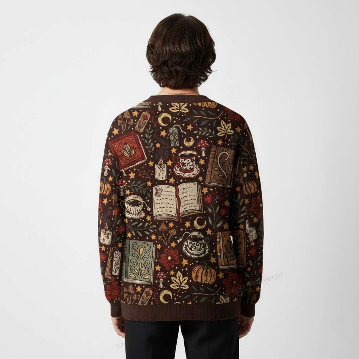 This cardigan captures the essence of autumn through illustrated books, pumpkins, and flickering candles—symbols of introspection and harvest. Each element evokes the quiet joy of reading under amber leaves, echoing traditions of storytelling passed down through generations.