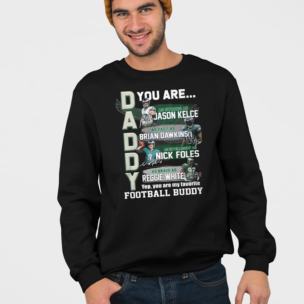 Show your love for football with the Daddy Eagles You Are Jason Kelce Brian Dawkins Nick Foles Reggie White Shirt. A tribute to iconic Philadelphia Eagles players, this shirt celebrates strength, speed, intelligence, and bravery. Perfect for any football fan and family!