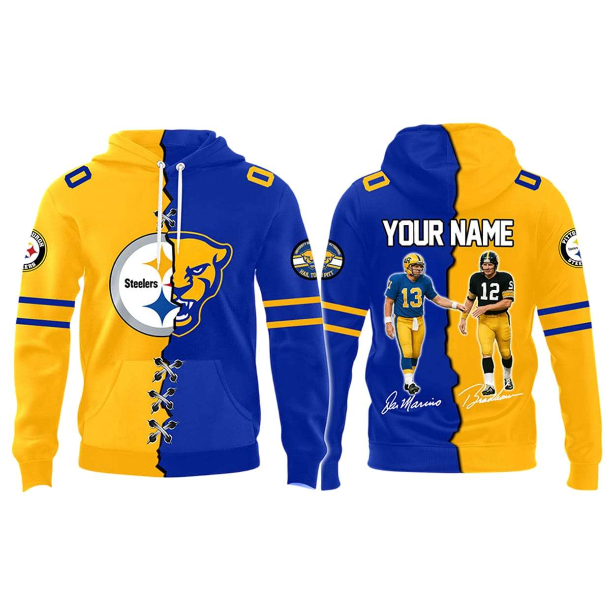 The Dan Marino Panthers x Terry Bradshaw Steelers Hoodie honors two football legends whose legacies define generations. This bold blue-and-gold split design unites Marino’s finesse and Bradshaw’s grit, reflecting the historic rivalry between Pittsburgh and Miami. A must-have for fans who value heritage, leadership, and the golden age of American football.