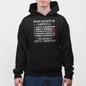 The Dear Racists In America Car Is Japanese Beer Is German Shirt is a bold statement piece that calls attention to the contradictions in racist rhetoric. This eye-catching shirt challenges prejudiced views with humor and social commentary. Featuring global flags and a reminder of the Native American heritage of the land, this shirt is perfect for those who want to speak out against racism in a creative and impactful way.