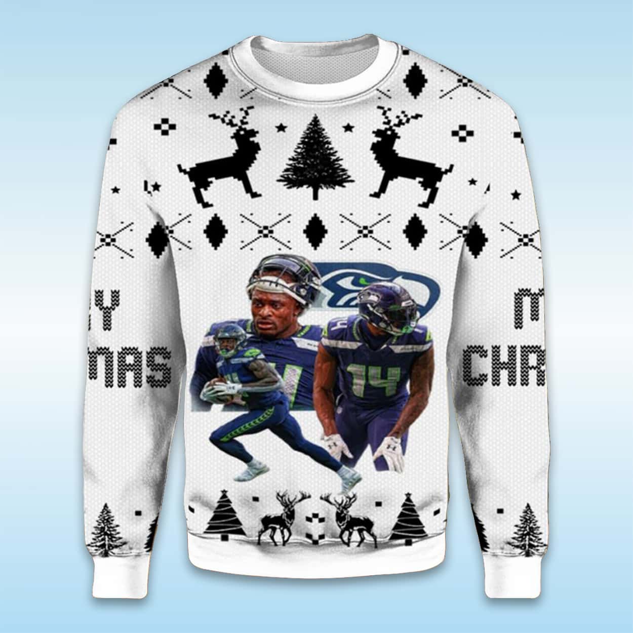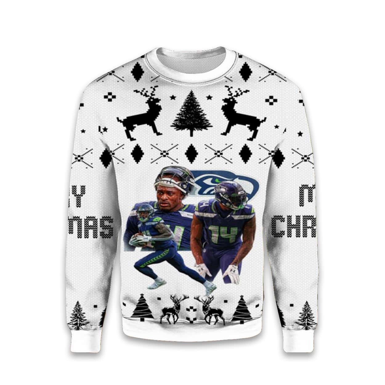This eye-catching sweater features key Seahawks players, specifically highlighting DeKaylin “DK” Metcalf (likely the player shown on the left) and Tyler Lockett (likely the player shown on the right with jersey number 14). The graphic is set against a black-and-white background that features traditional holiday knit patterns like reindeer, Christmas trees, and snowflakes, giving it that perfect “ugly” aesthetic. Show your 12th Man loyalty and stay warm through the holiday season!