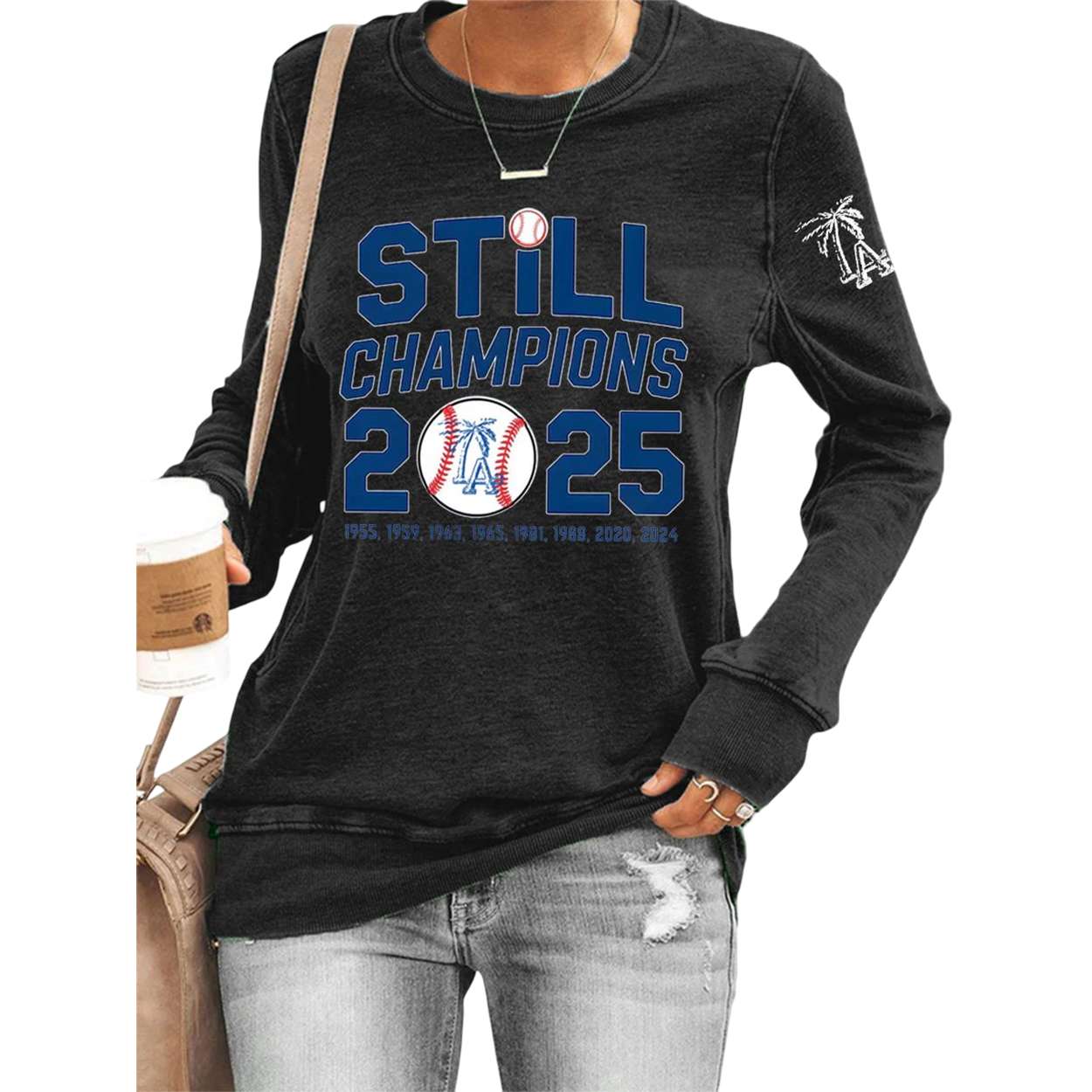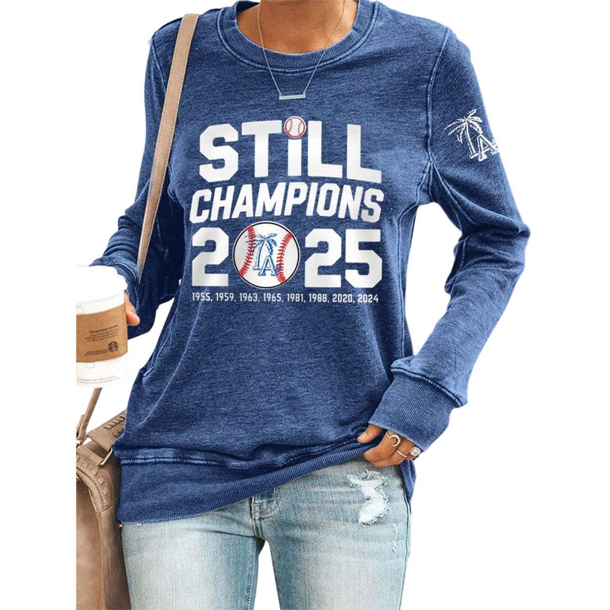 The phrase “Still Champions 2025” isn’t just bold—it’s prophetic. This sweatshirt marks the Dodgers’ nail-biting extra-inning Game 7 win, a moment etched in baseball lore. The baseball graphic embedded in the text mirrors the tension and precision of that final pitch.