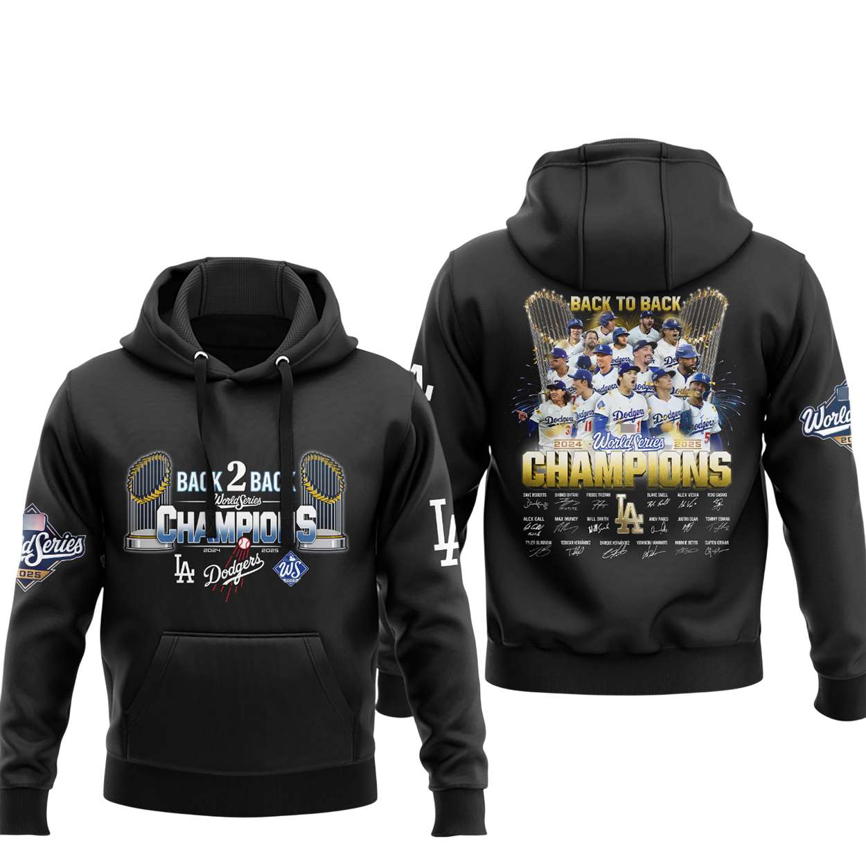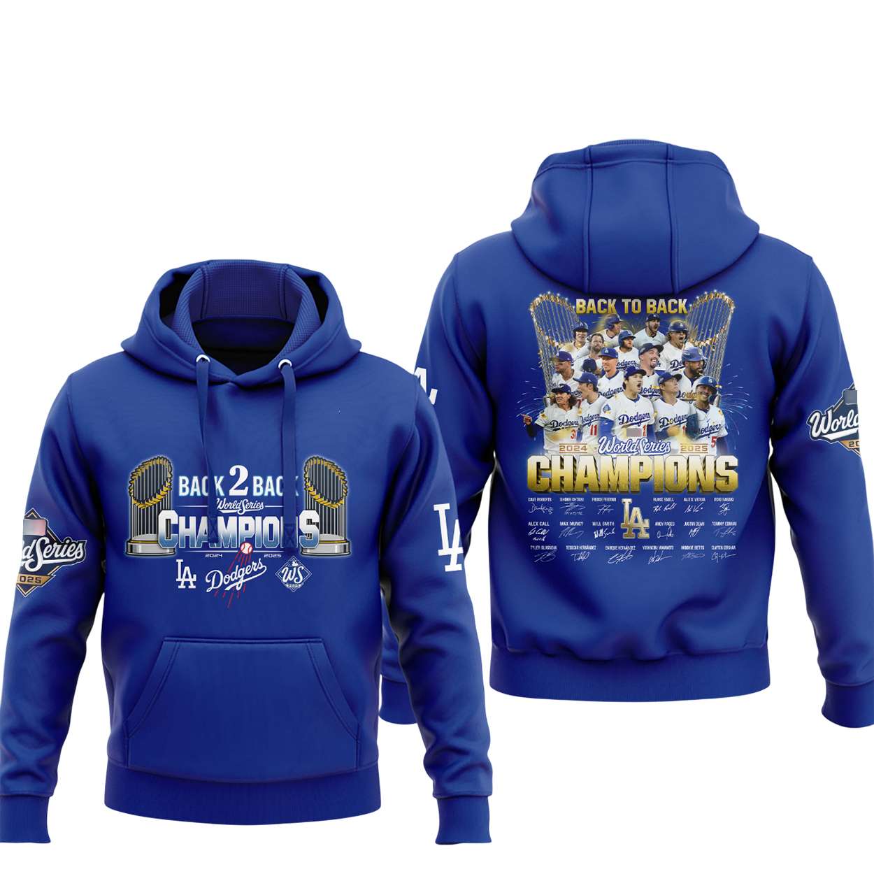 This hoodie immortalizes the Dodgers’ dramatic 2025 World Series run, highlighted by a wild double play in Game 6 that crushed Toronto’s rally and forced a decisive Game 7. The front design features twin championship trophies and bold “Back 2 Back” graphics.