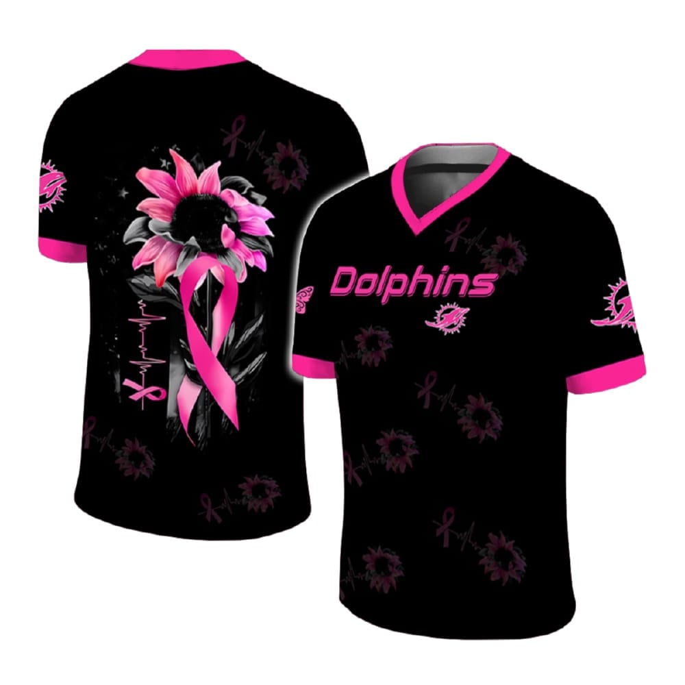 This jersey is more than fan gearâit’s a tribute to resilience. Released annually to mark Breast Cancer Awareness Month, this jersey blends sports culture with social impact. The bold âDolphinsâ lettering in pink, paired with the iconic Miami Dolphins logo and scattered ribbon symbols, creates a powerful visual statement. The back features a striking sunflower with a pink ribbon at its heart, surrounded by heartbeat motifsâsymbolizing life, hope, and the fight against cancer. This jersey stands as a wearable reminder of the lives touched and the battles fought.