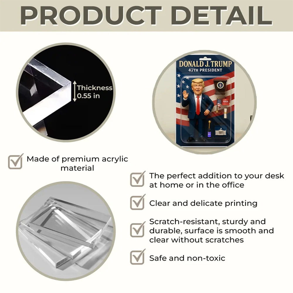 This Donald Trump 47th President Acrylic Plaque Block features a detailed 3D depiction of Donald Trump in a suit and red tie, captured mid-wave against a backdrop of the American flag. The packaging highlights his title “47th President” in gold lettering, accompanied by miniature accessories including a podium with the presidential seal, a MAGA hat, a small U.S. flag, a microphone, a Truth Social phone, and a White House model. Perfect for display on desks at home or in the office, it’s a striking tribute to his leadership.