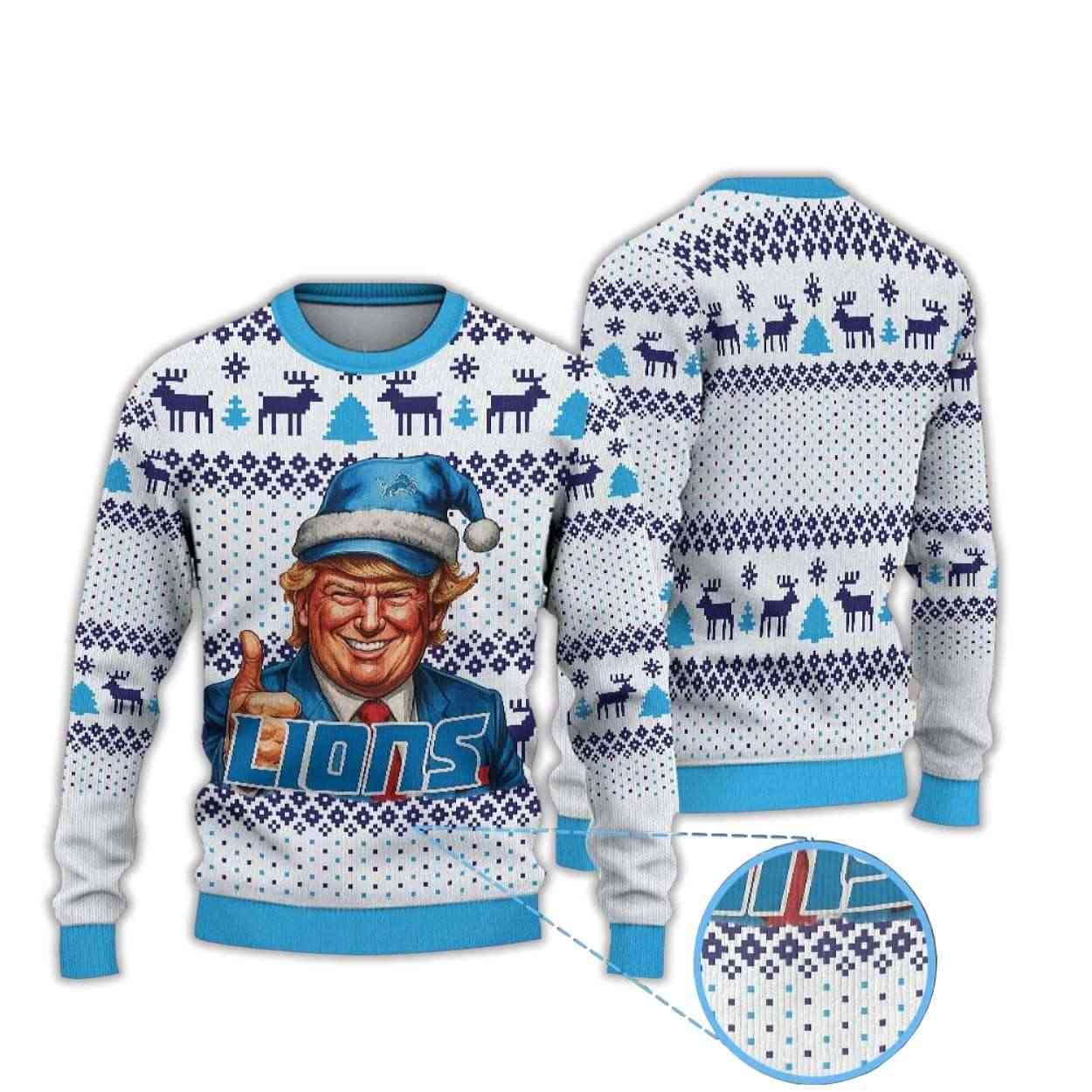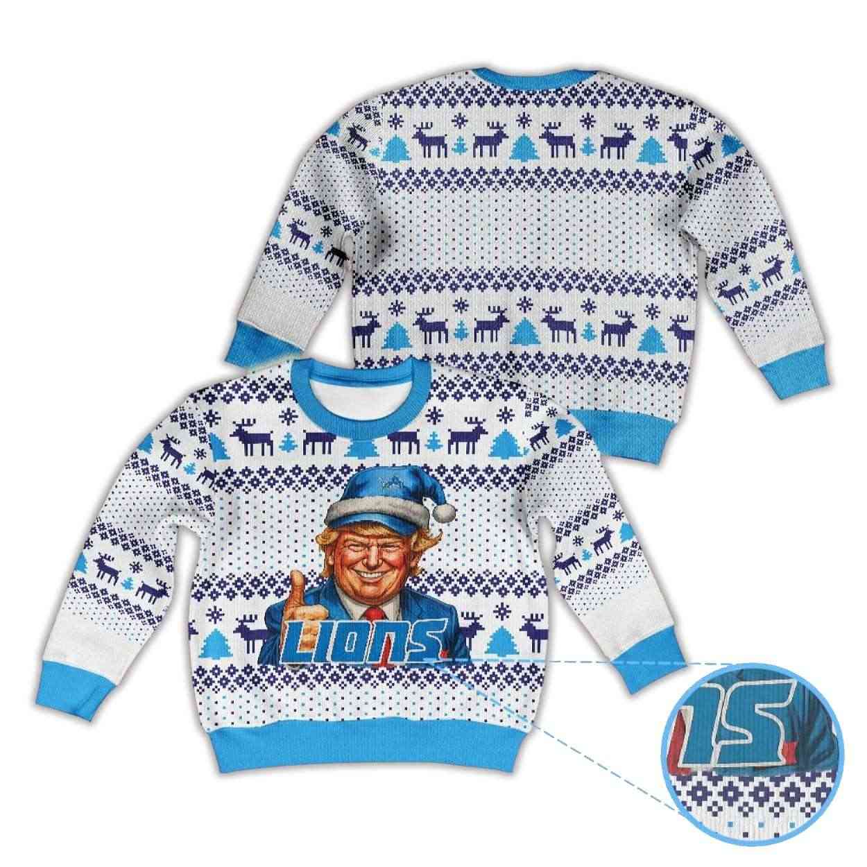This witty sweater spotlights a smiling Donald Trump donning a Santa hat in Lions colors, merging political satire with sports enthusiasm. The expressive artwork captures his recognizable confidence, creating a playful dialogue between leadership, fandom, and holiday humor.