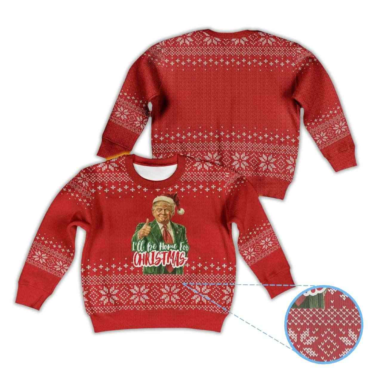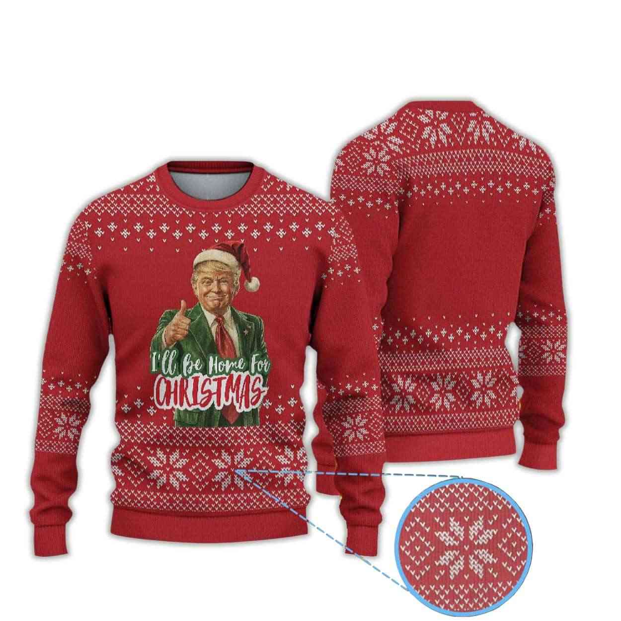 This red sweater captures the unmistakable image of Donald Trump wearing a Santa hat and giving a confident thumbs-up — a nod to his signature self-assured style. The phrase “I’ll Be Home for Christmas” humorously echoes a familiar sentiment, blending politics with playful holiday irony.