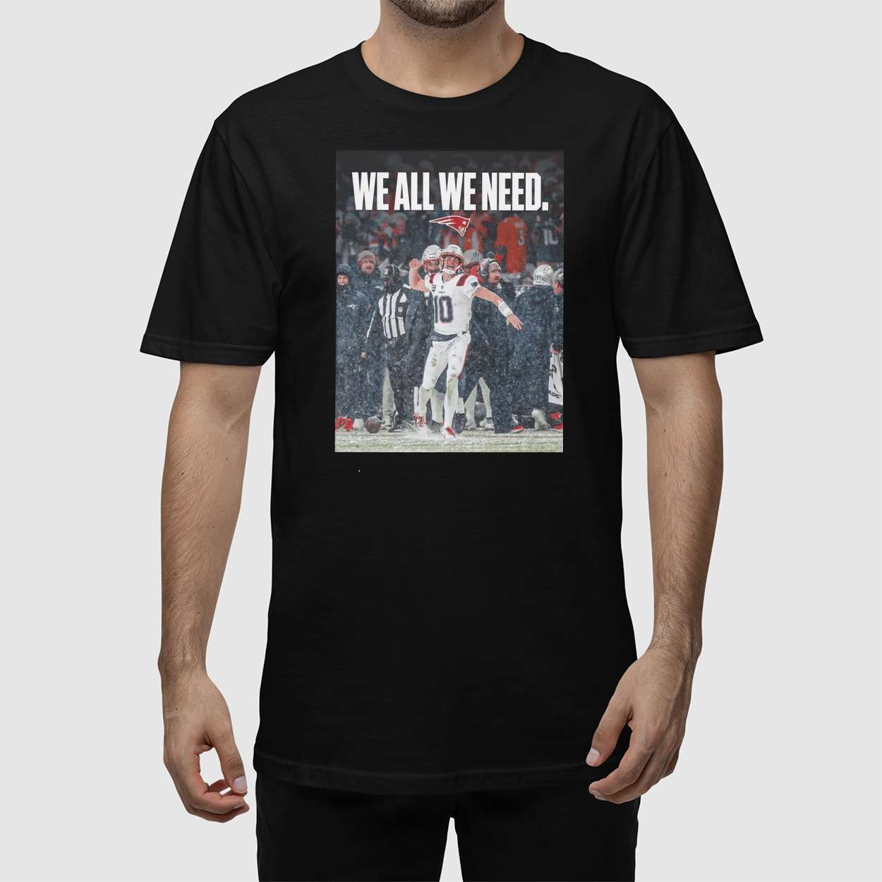 Honor grit and unity with the Drake Maye We All We Need Shirt. Featuring a powerful snow-drenched moment of triumph, this design captures the essence of teamwork, resilience, and rising leadership. A bold tribute to determination and shared purpose.