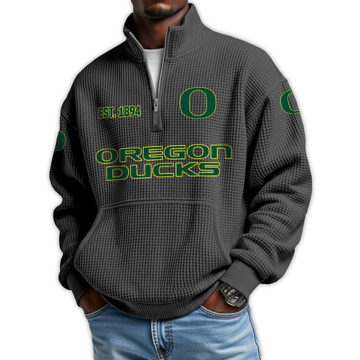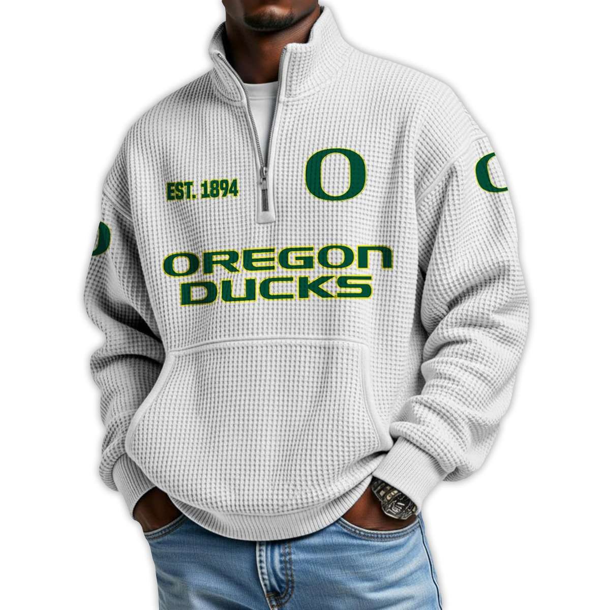 Show your pride with the Ducks Football Est 1894 Waffle Stand Collar Half Zip Sweatshirt. Featuring bold graphics and historic emblems, this pullover connects fans to Oregon’s football legacy, iconic players, and the innovative spirit of a team that reshaped college athletics.