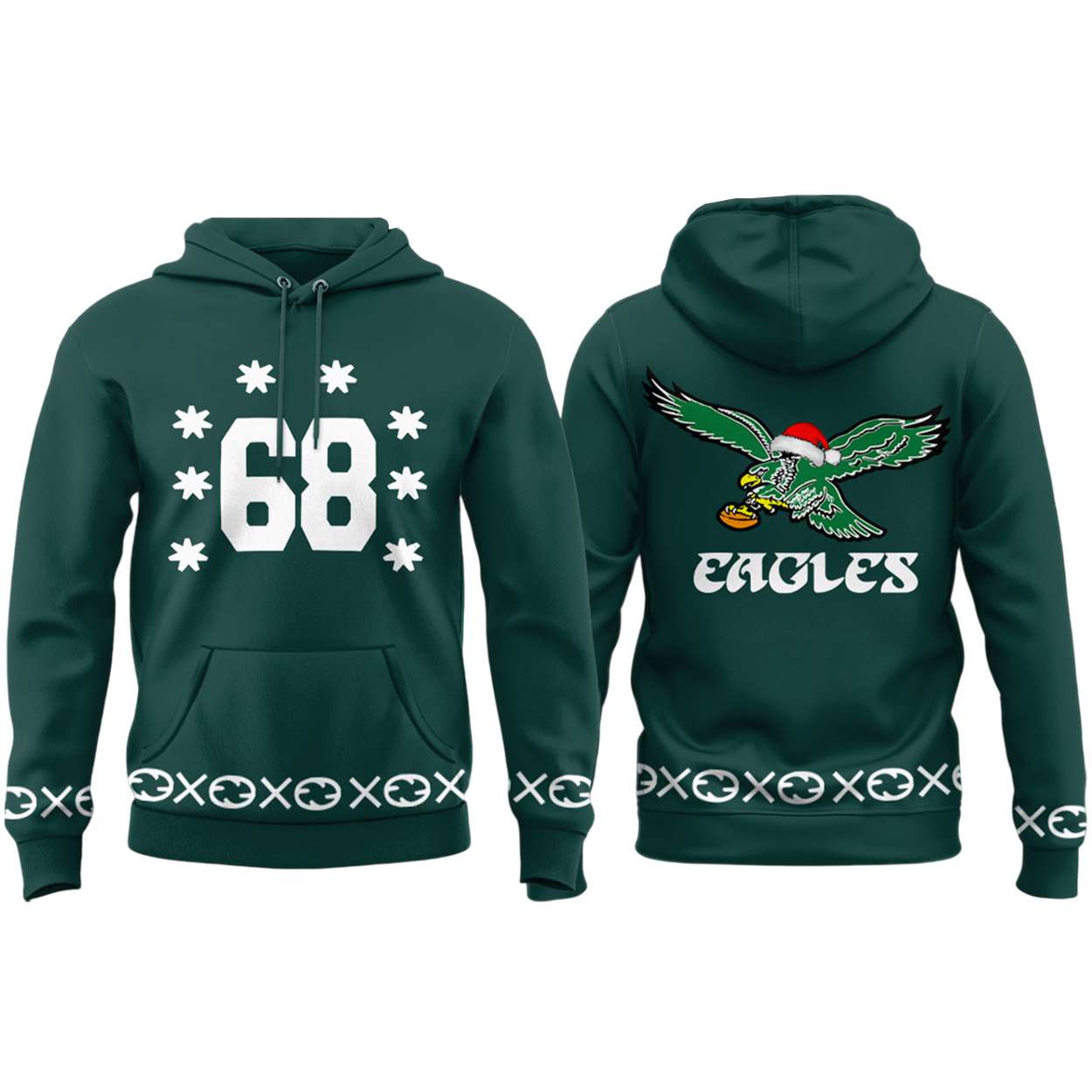 The back showcases a fierce eagle in a Santa hat clutching a football—an emblem of strength wrapped in seasonal charm. Below it, “EAGLES” roars in stylized font, echoing the team’s legacy and the city’s unwavering loyalty through decades of triumph and transformation.