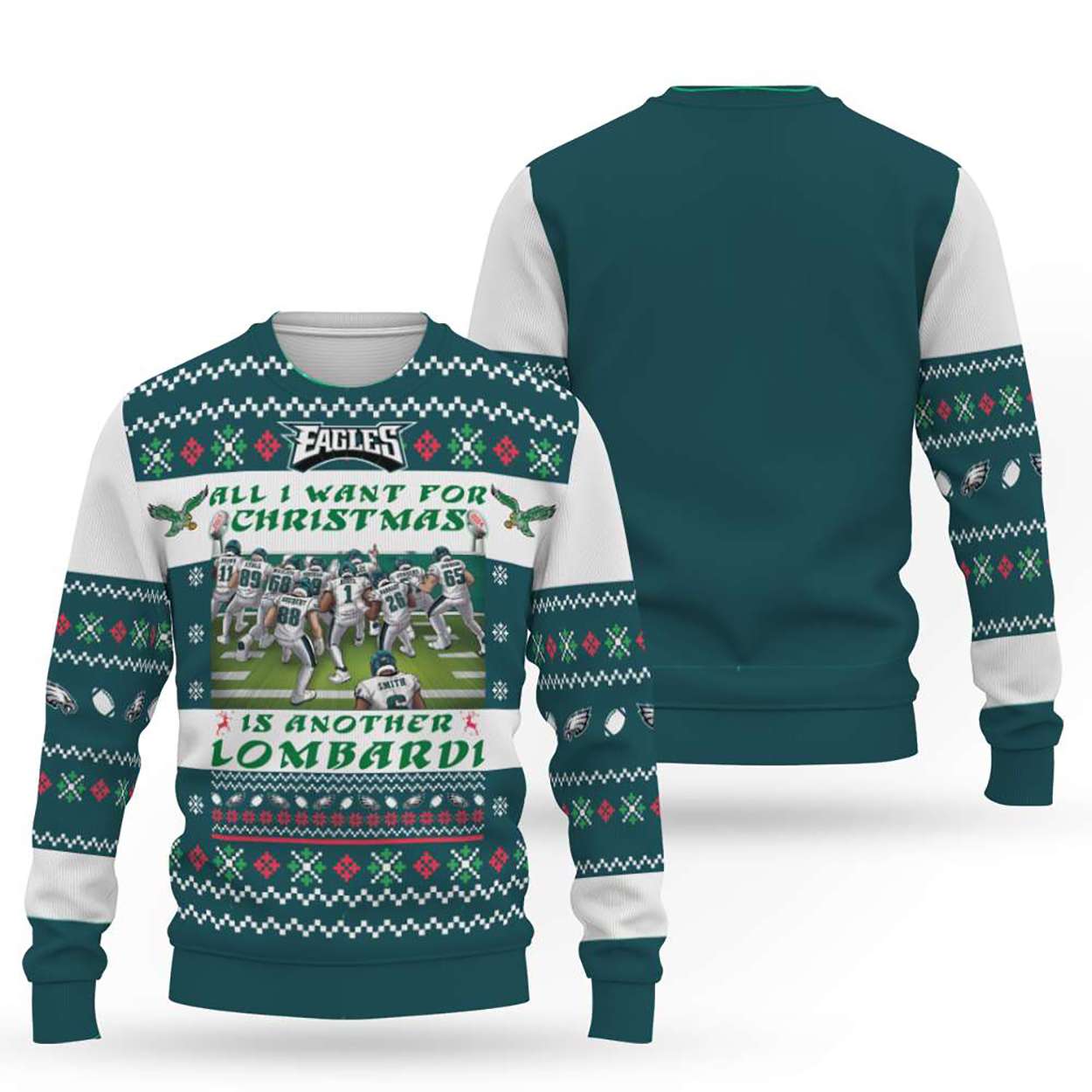 Show your Eagles pride this holiday season with the Eagles All I Want For Christmas Is Another Lombardi Ugly Sweater. Featuring iconic players, festive patterns, and a nod to Super Bowl glory, it’s perfect for fans who live for football and tradition.