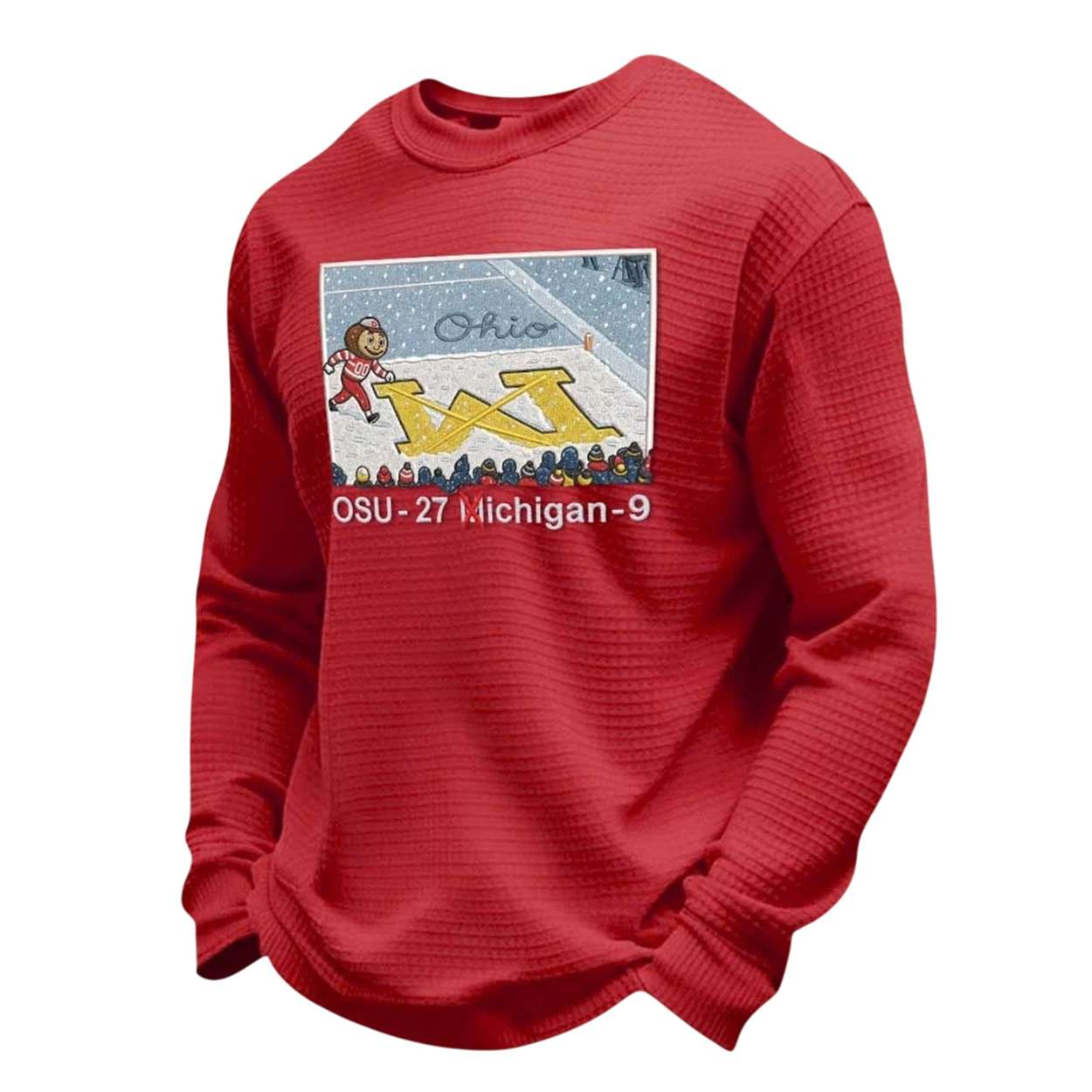 Show your Buckeye pride with the Erase The M Ohio State Waffle Sweatshirt. Featuring Brutus Buckeye and a snowy rivalry scene, this design honors OSU’s iconic victory over Michigan. A bold tribute to tradition, grit, and unforgettable gridiron history.