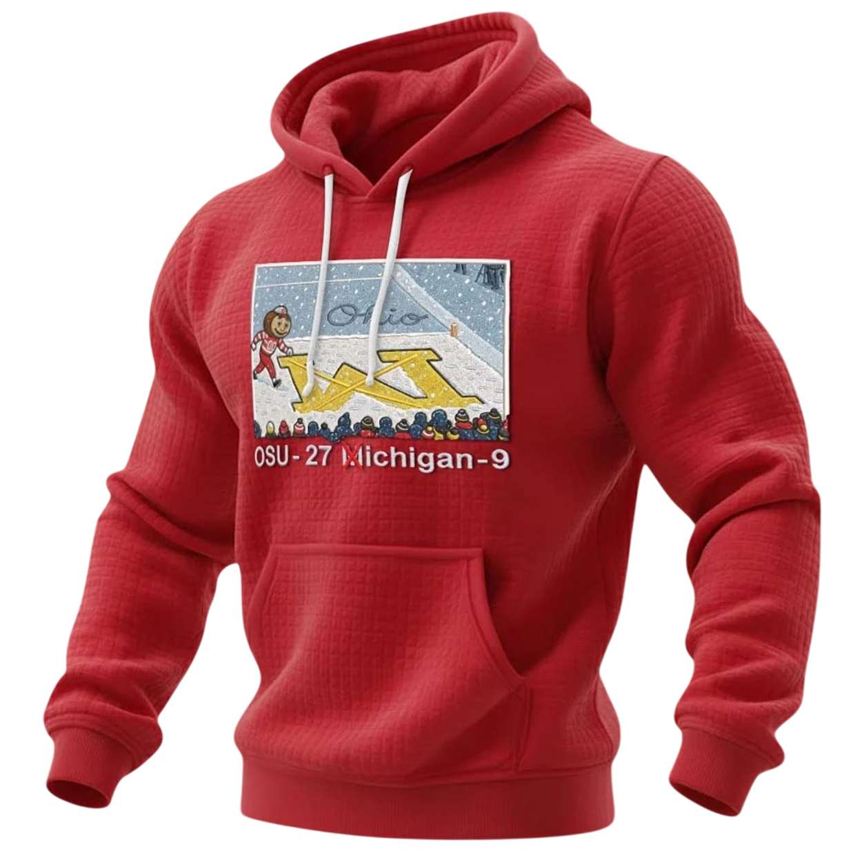 This sweatshirt captures the fierce rivalry between Ohio State and Michigan, immortalizing the 27–9 triumph with Brutus Buckeye stomping the iconic yellow “M.” It’s a visual anthem of dominance, loyalty, and the enduring spirit of college football’s most storied feud.